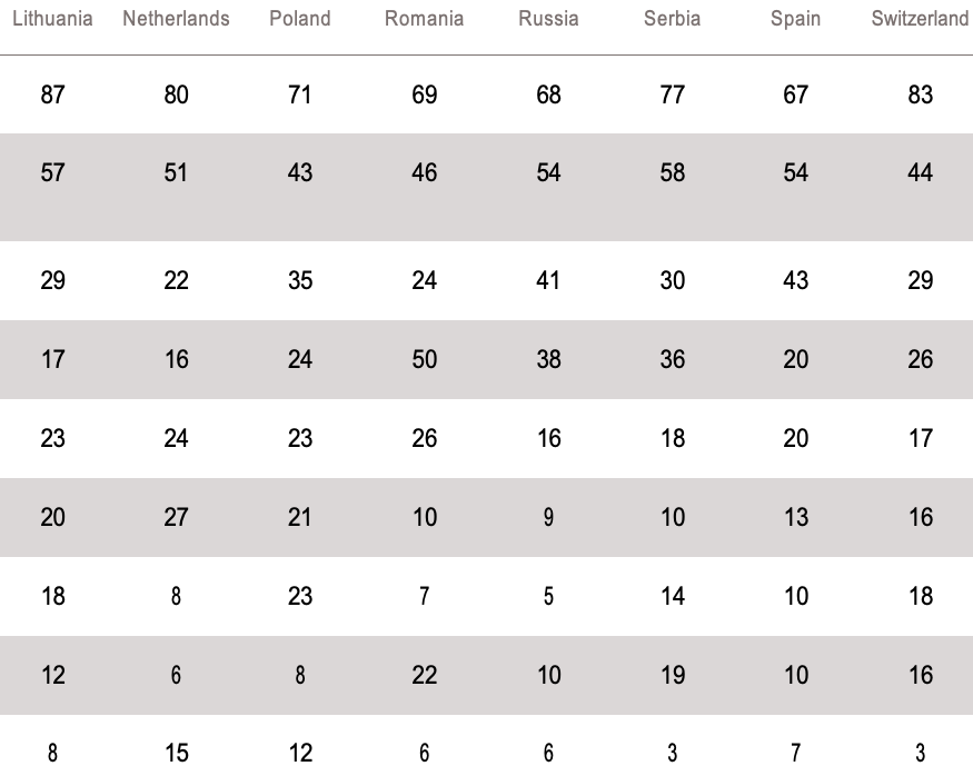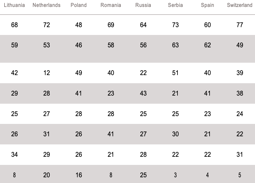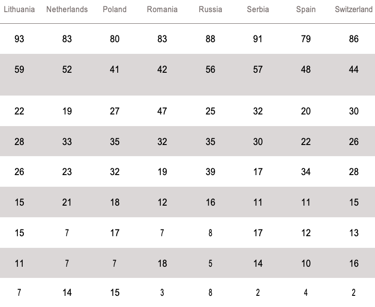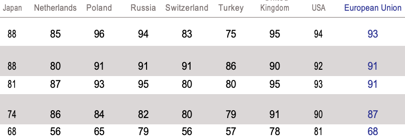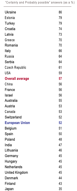 Danes and Lithuanians (61%), the Germans and Hungarians (60%), the Belgians (58%), the Austrians, Ukrainians and Turks (57%), the Dutch and Swiss (56%), the Finnish and Latvians (55%).