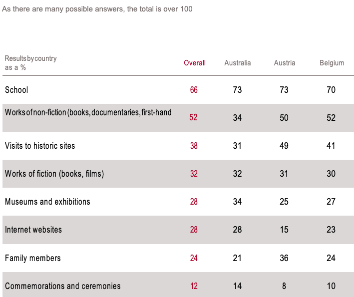 Museums and exhibitions, cited by 16% overall, are cited most often as one of the main sources of knowledge about the extermination of the Jews by respondents in Australia, Hungary and Poland (21%), the USA (22%), Belgium (24%), Denmark (25%), the Netherlands (27%), the United Kingdom (28%) and Israel (31%).