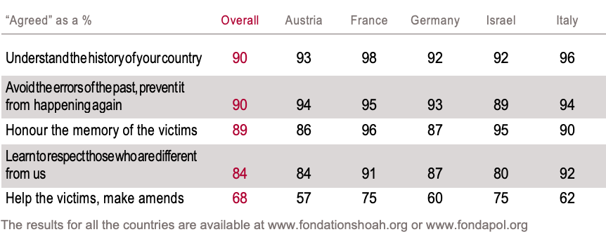 The option “to improve historical awareness of the atrocities committed by the Nazi regime”, chosen overall by 57% of respondents, was most frequently cited by the Israelis (80%), the Greeks (72%), the Australians (70%), the Canadians and British (68%), the Americans and Russians (66%), the Danes and Lithuanians (62%).