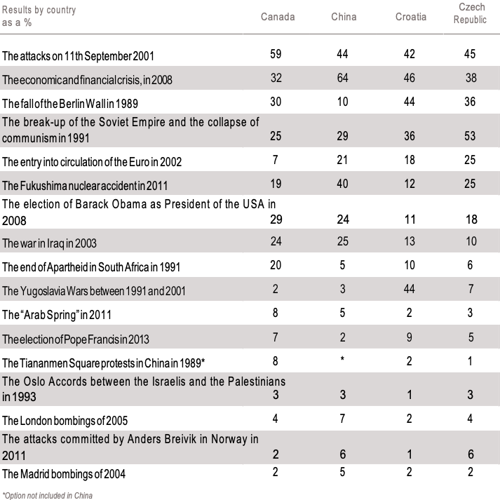 The second most cited event overall, the economic and financial crisis in 2008, came out on top among the Chinese (64%), the Hungarians (58%), the Romanians (54%), the Greeks (52%), the Croats (46%) and the Indians (42%). It was chosen less often by the youngest respondents, who have perhaps been less exposed to its effects as the majority are still to leave school: a third of 16-19 year-olds (33%) chose this option, as opposed to 40% of the 25-29 year-olds.