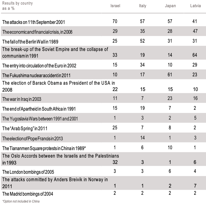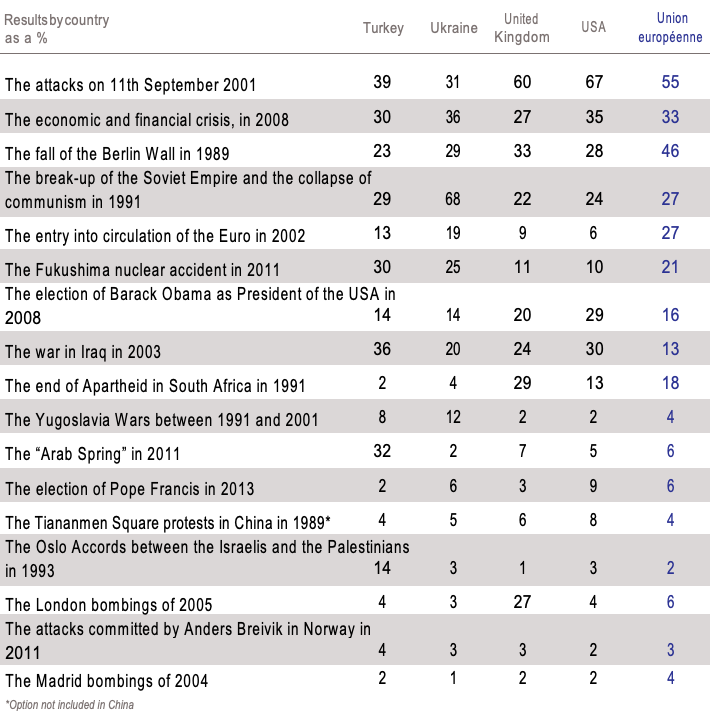 Lastly we wanted to know which events, in their eyes, define their era, as history never stands still. We asked them to single out the events that they believe to have been of most importance since the fall of the Berlin Wall in 1989 and up until the election of Pope Francis in 2013, a period covering the Tiananmen protests in 1989; the end of Apartheid in South Africa in 1991; the 9/11 attacks in 2001; the creation of the Euro in 2002; the war in Iraq in 2003; the financial crisis or election of Barack Obama in 2008; and the Arab Spring in 2011. All of these events – and even more recent happenings, such as the fatal attacks against Charlie Hebdo‘s offices and the freedom of expression, against the police and French Jews, which cost the lives of 17 people between 7th and 9th January 2015 – are fresh in the collective memory. They have entered the collective conscience and will in time overlap older memories, inevitably altering our perception and interpretation of those earlier events.