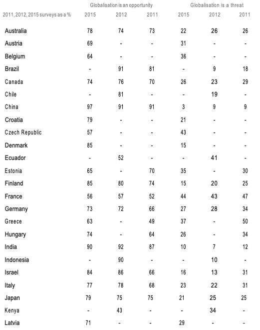 Having said this, since 2011, young people in developed countries have also started to globalisation in an increasingly favourable light. As such, between 2011 and 2015, the level of negativity towards it has diminished in the United Kingdom, Australia, Canada, Japan and even in Germany. The clearest progression has been made in Israel, where globalisation is perceived as an opportunity by 84% of the young people, as opposed to 66% in 2011. This movement is neither general nor irreversible, as shown in the USA where levels of positivity towards globalisation among young people have dropped by 3 points between 2011 and 2015.