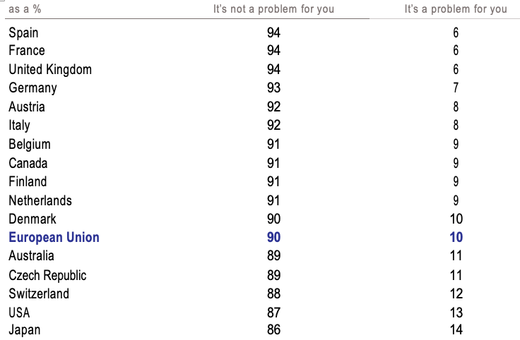 The world has come a long way since 1914, when rivalries between nations were reflected in European public opinion, which was characterised by a heightened sense of nationalism. Nowadays, out of all their attitudes towards diversity, it is differences in nationality that those surveyed find least problematic. Overall, 91% of those surveyed feel that they do not have a problem with people of a different nationality to theirs.