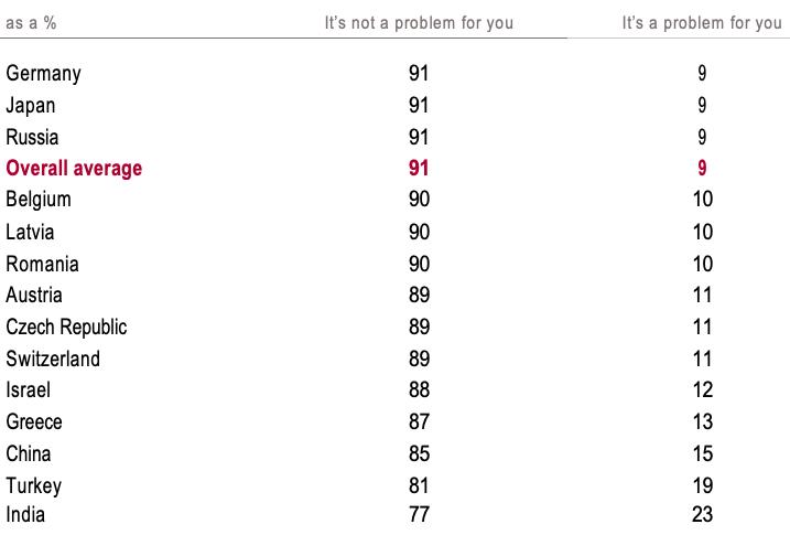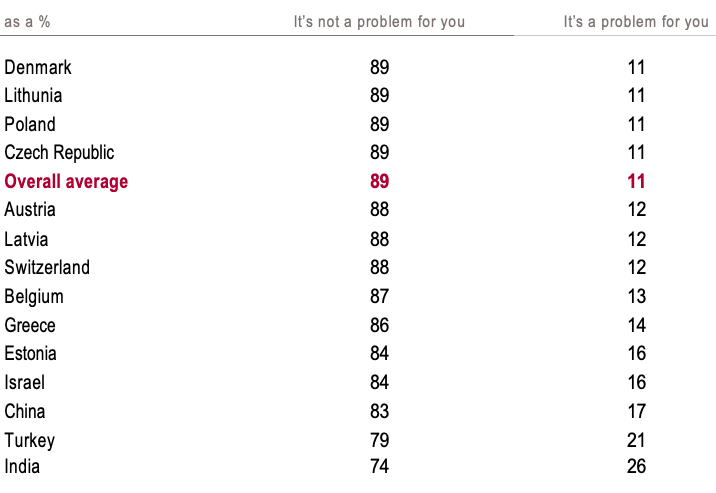 When asked to express an opinion towards those of a different religion, 89% of respondents declare that this is not a problem for them. Levels of religious tolerance are below average in India (74%) and Turkey (79%) when compared with overall levels, and notably those expressed in European states (91%), even though a very large majority of Indians and Turks are indeed still tolerant.