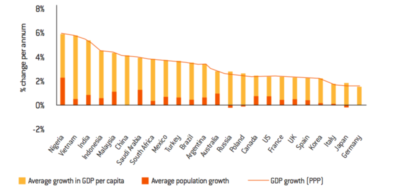 In Africa, Nigeria and Ethiopia will be the biggest growth drivers, after the emergence of South Africa and demographically smaller countries (Mauritius, Botswana).