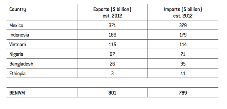 In terms of trade, BENIVM had in 2012 a trade surplus estimated to be slightly more favourable than that of the BRICS.