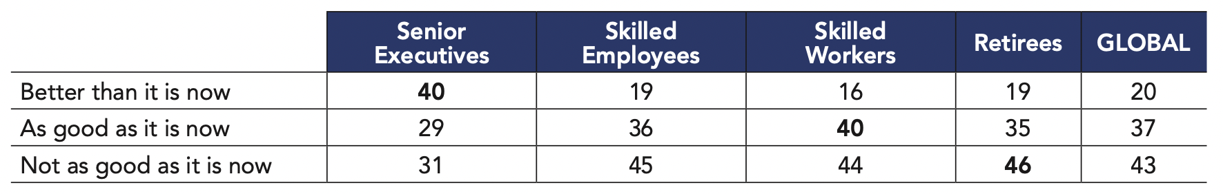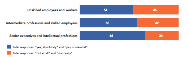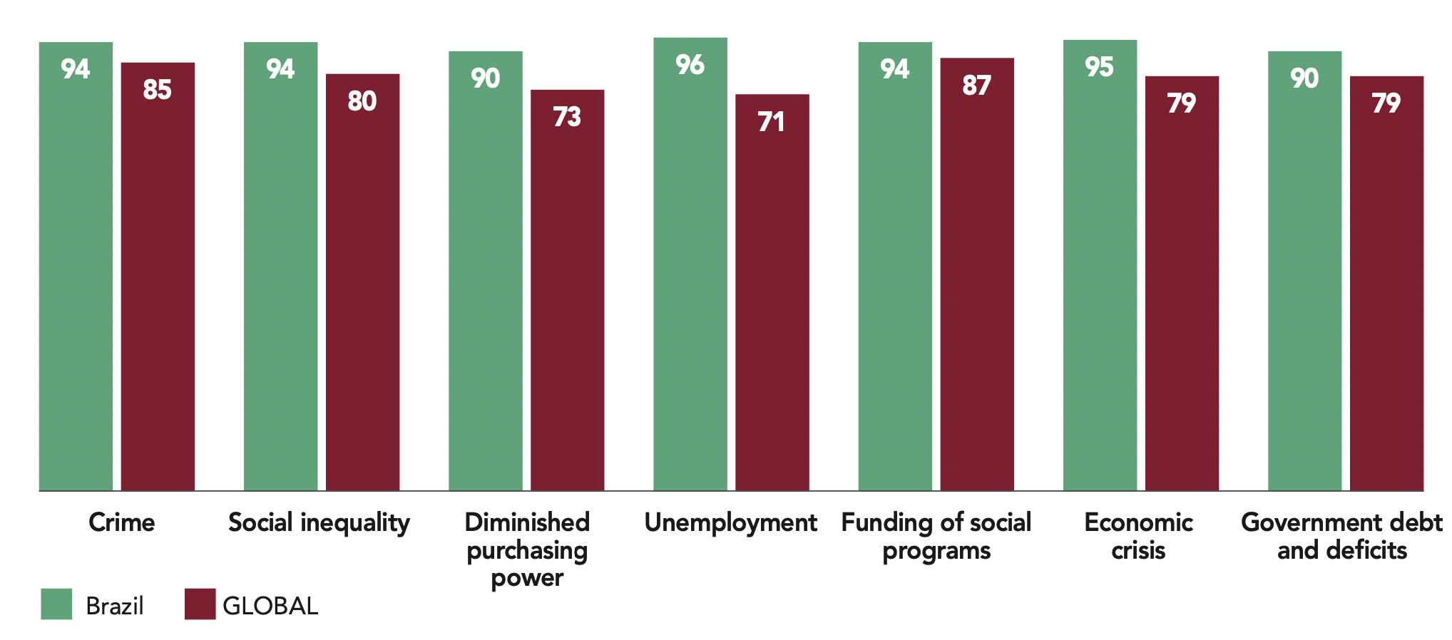 One of Brazil’s major problems is the immutability of its social inequalities. Among the populations of the 42 democracies surveyed, Brazilians are the most worried about social inequalities (94%). We are witnessing a severe deterioration of the welfare state created by the 1988 constitution and consolidated by the successive governments of Lula da Silva and Dilma Rousseff. Now, the model of the Brazilian welfare state is impractical from a taxation perspective and the limits of its functioning – rigid and socially unjust – give rise to a widespread level of frustration. Our survey shows that almost all Brazilians (94%) are worried about the future of social program funding. It is indeed crucial and necessary to conduct more efficient social policies and the welfare state must quickly reinvent itself through new objectives, new financing methods and new definitions of its beneficiaries in order to improve its functioning. By the same token, though the idea that the structural tendencies of Brazil’s economic decline (dysfunction of public services, social security deficit, deteriorating tax system, etc.) are almost exclusively due to corruption is widely agreed upon, the underlying issue is obviously deeper and more related to low levels of productivity.