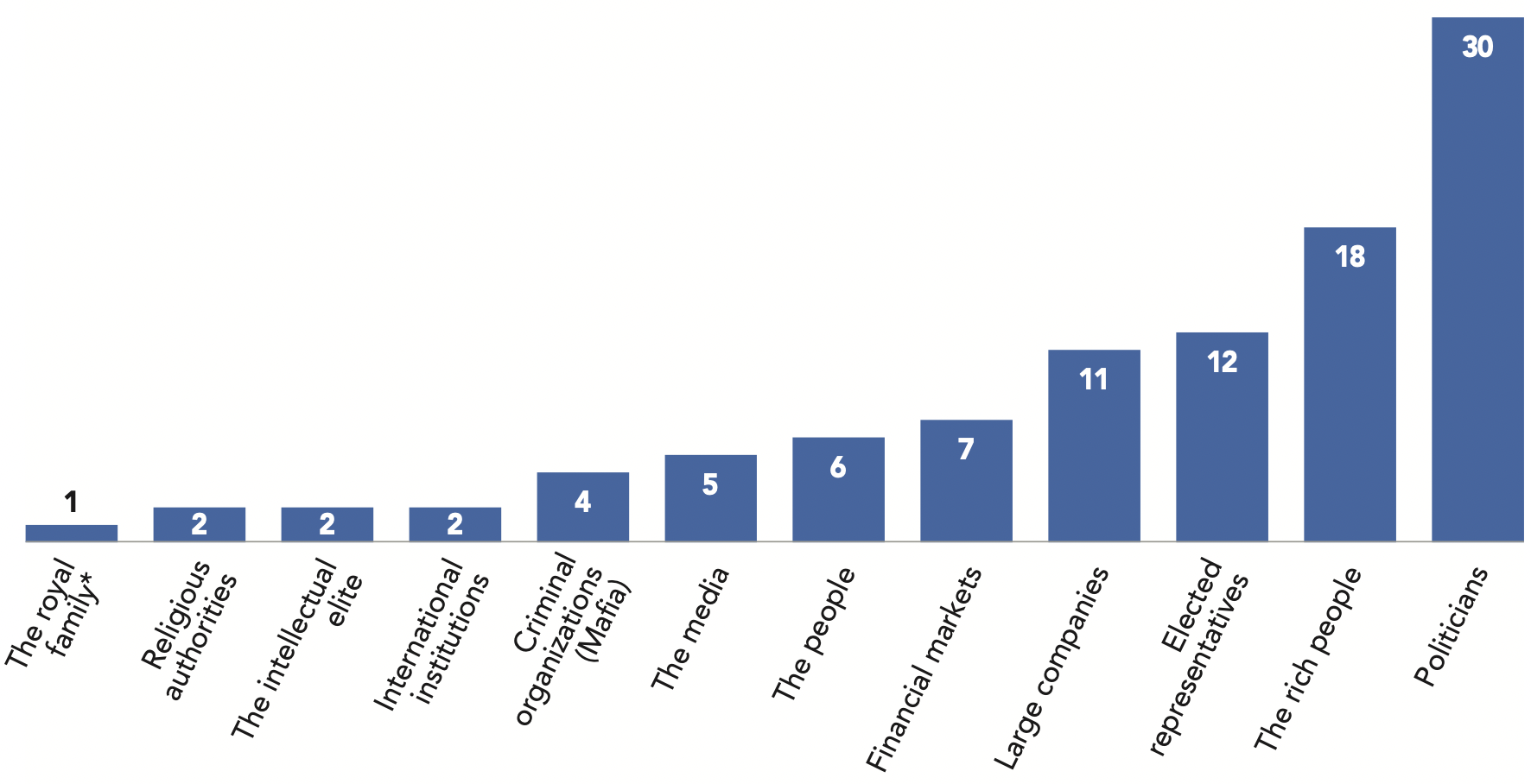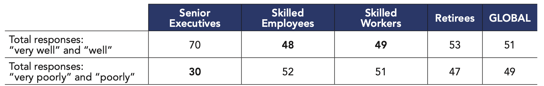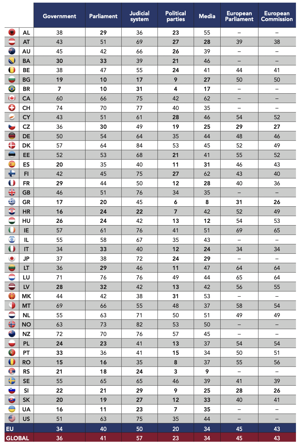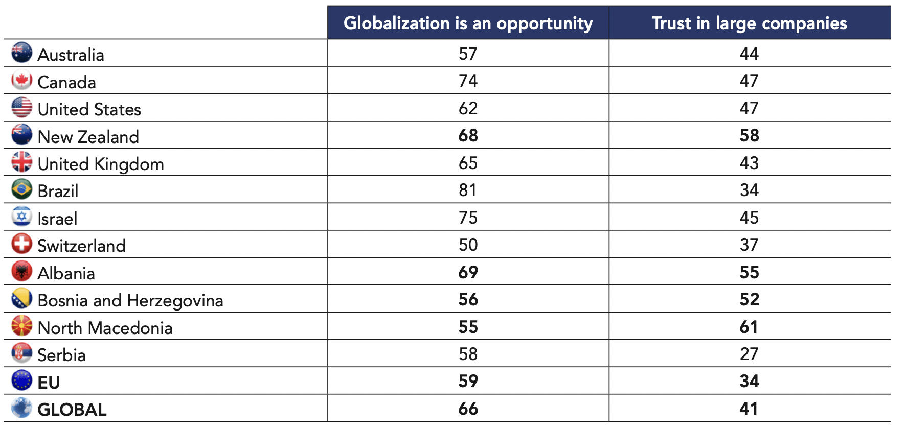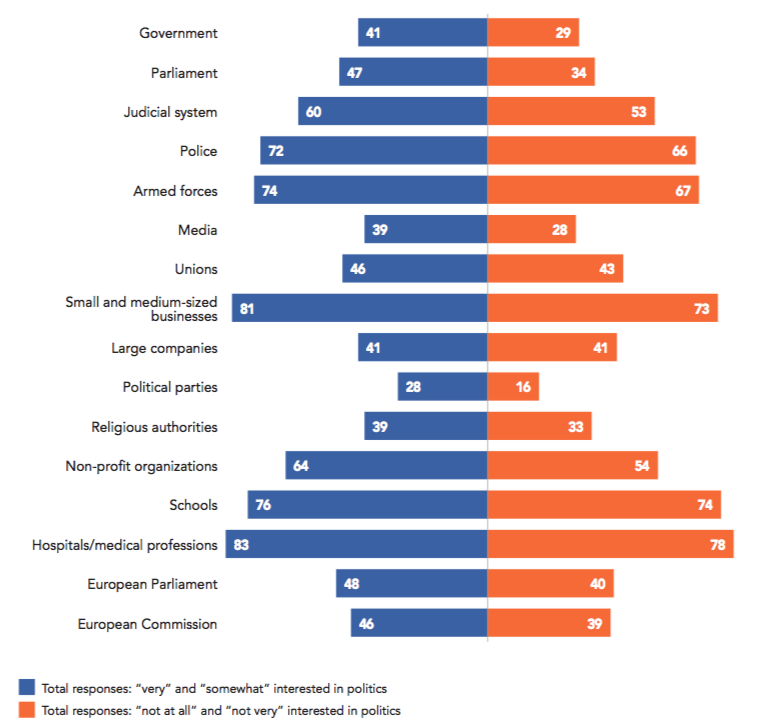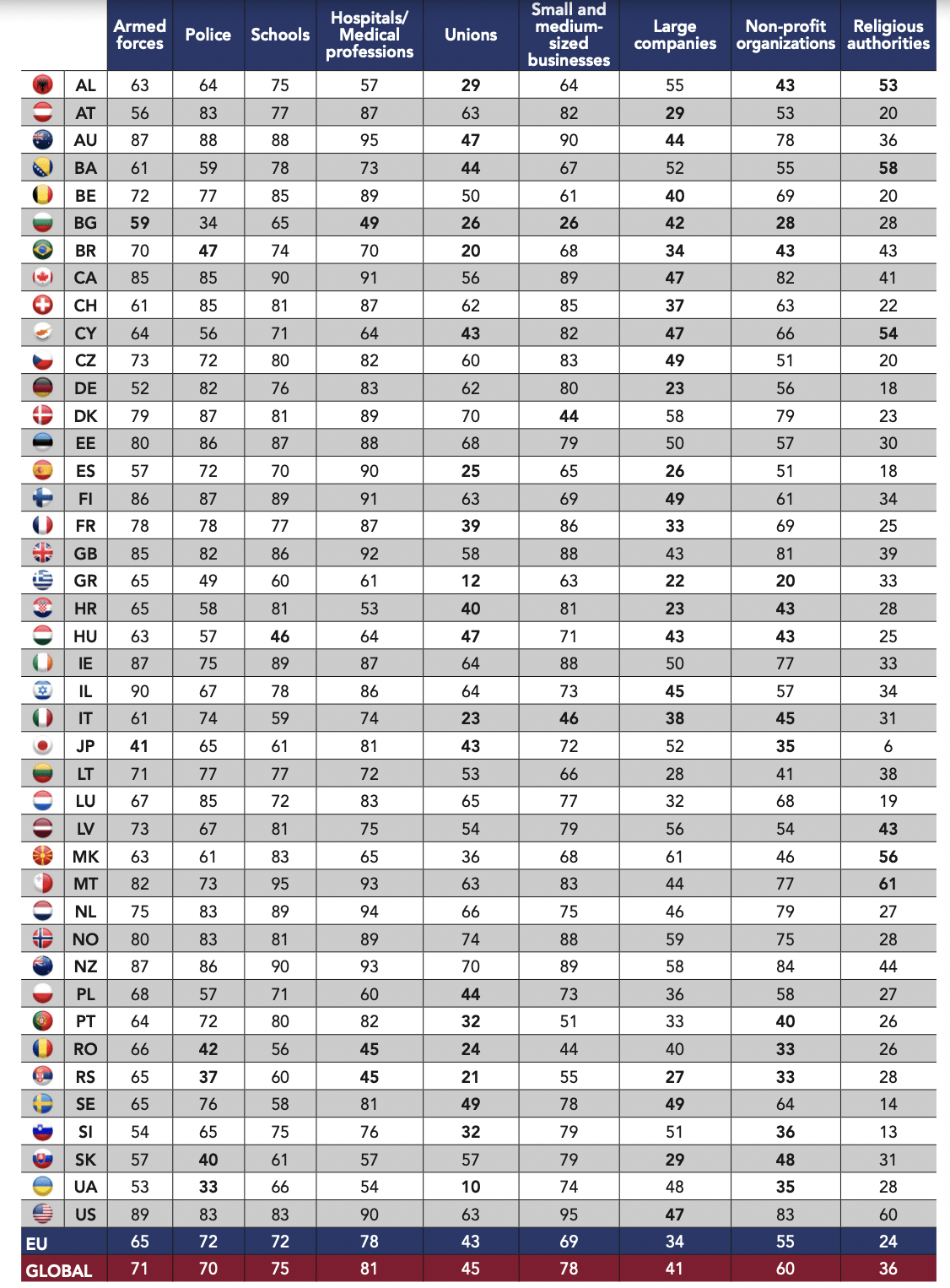 It should be underlined that national variations can largely depend on the histories of the surveyed countries. For example, a majority of Japanese respondents trust large companies (52%) but many fewer trust the military (41%). In Israel, on the contrary, the armed forces enjoy a massive level of trust (90%). The latter country is characterized more as a high-trust society, both for the level of trust attributed to its political institutions (58% trust Parliament, 67% trust the judicial system, 35% trust political parties) as well as that attributed to its civil institutions.