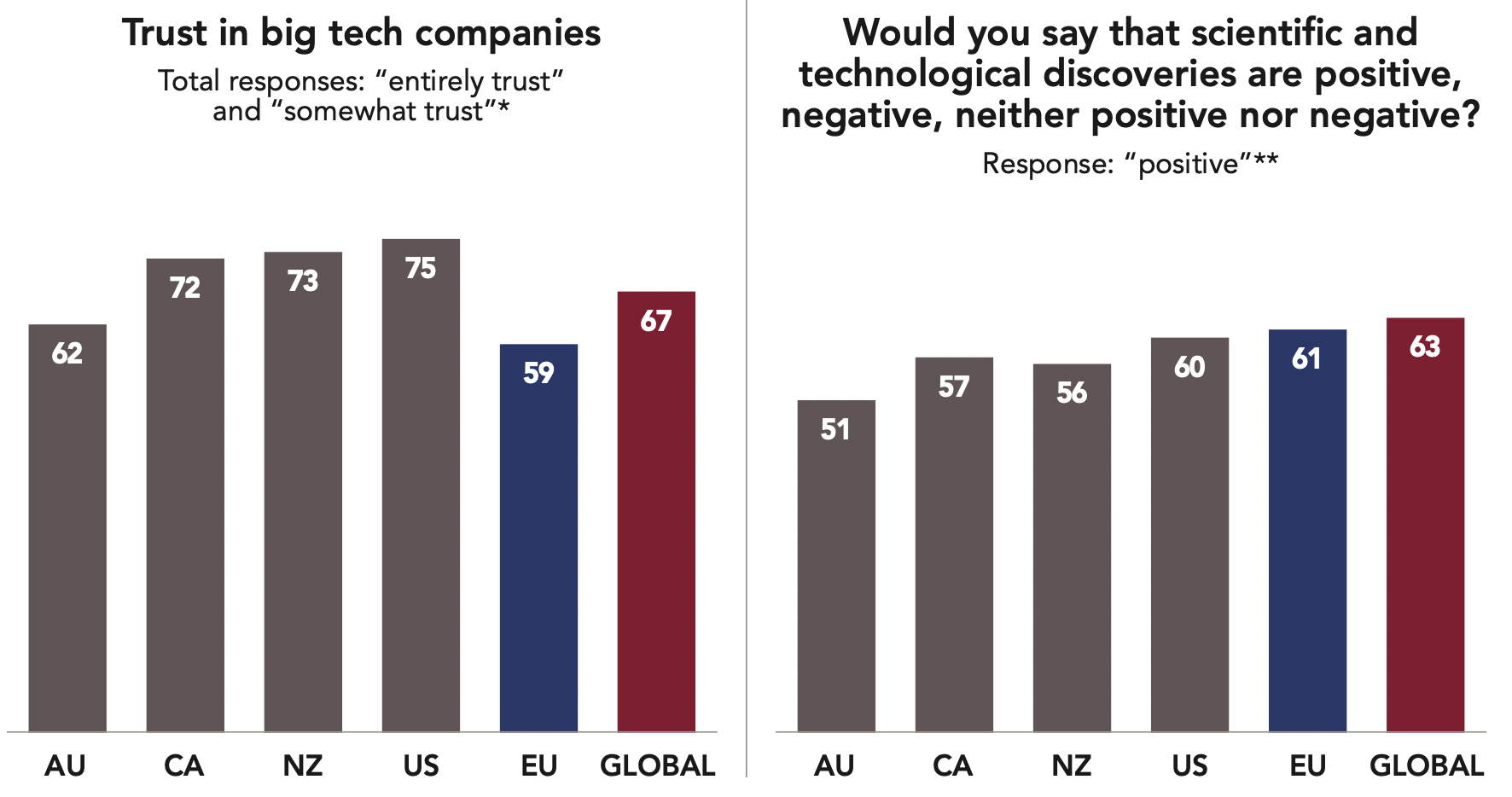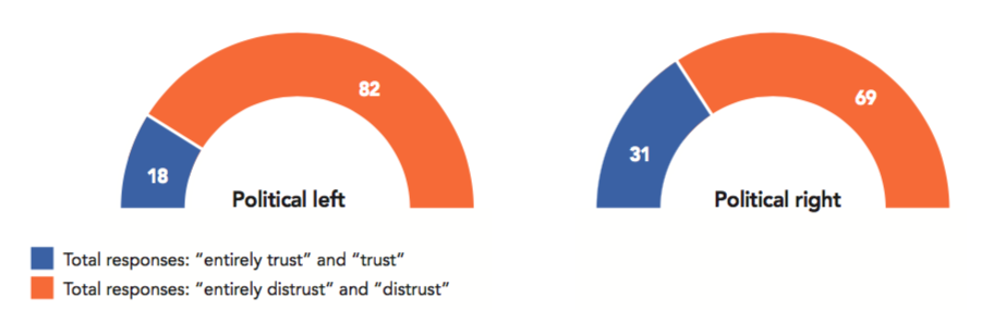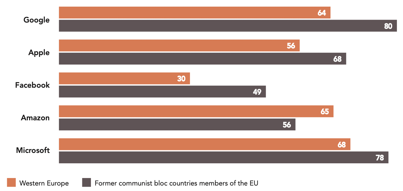 While most respondents say they do not trust big businesses, Google, Apple, Facebook, Amazon and Microsoft, some of the most powerful companies in the world, inspire high levels of trust, close to that of small and medium-sized businesses. A vast majority of respondents say they trust Microsoft (77%), Google (75%), Amazon (71%) and Apple (69%). Only Facebook generates a majority level of mistrust (58%). Mark Zuckerberg’s company has recently been involved in numerous controversies including its influence in politics, its association with fake news, and its handling of users’ personal data for electoral influence seen on an unprecedented scale. Facebook is also the only company among these five that provides a platform for public partisan political action, which perhaps results in citizens viewing the social network as more directly linked to political debate and action.