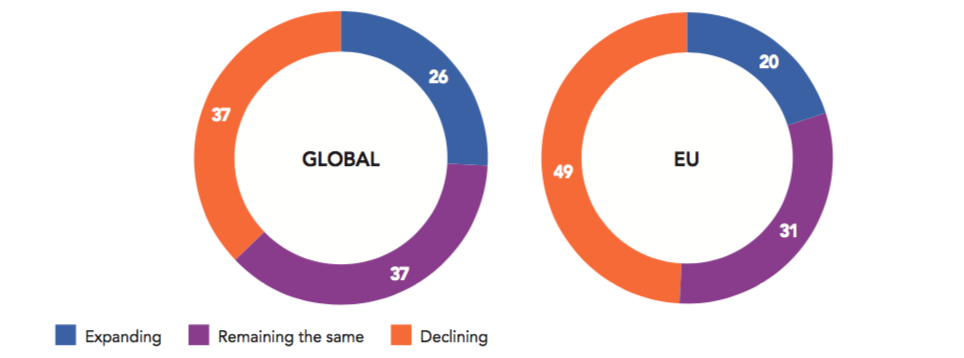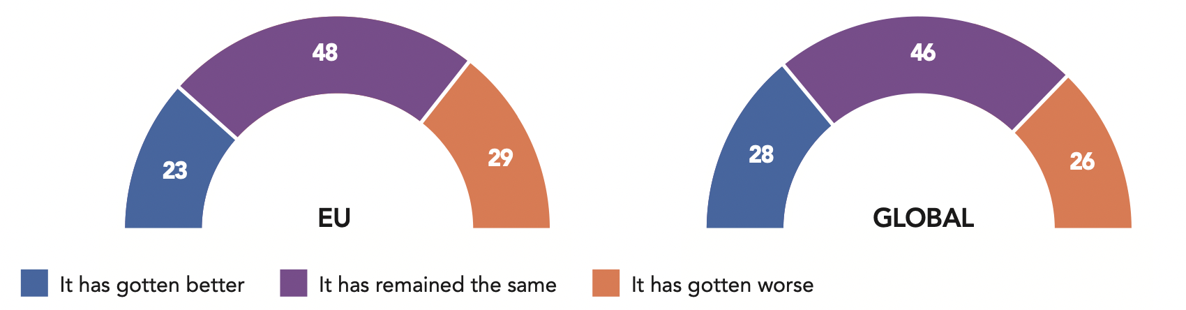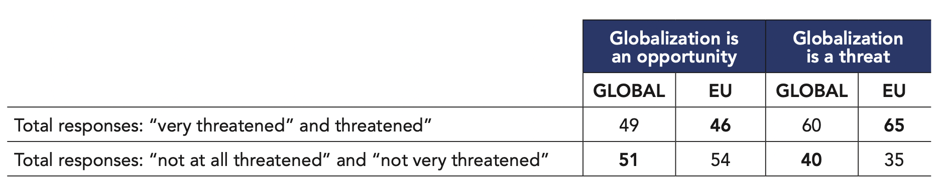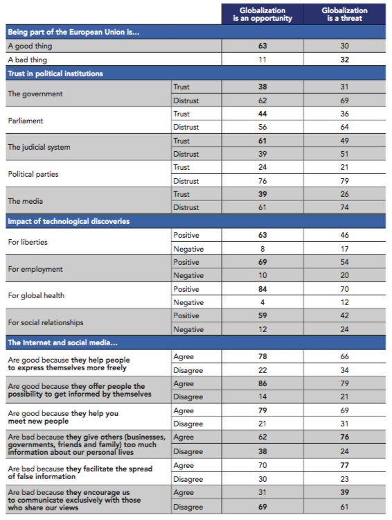 Concern measured by the survey can reflect different realities, particularly when it comes to the U.S. in 2019. Public opinion can be divided, often because of strong opposition to the current government. Thus, if part of American society (43%) is worried about their country’s international posture when responding to our survey, should this be an expression of real systemic concern or opposition to President Trump’s (foreign or domestic) policy? Outside the U.S., a sense of concern can also be understood as a reaction to some of the Trump administration’s foreign and trade policy discourse and decisions, which may fuel a sense of further disruption in an already uncertain world.