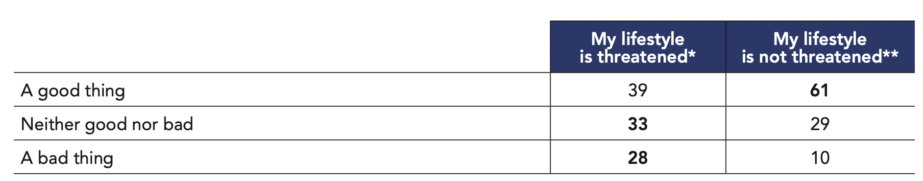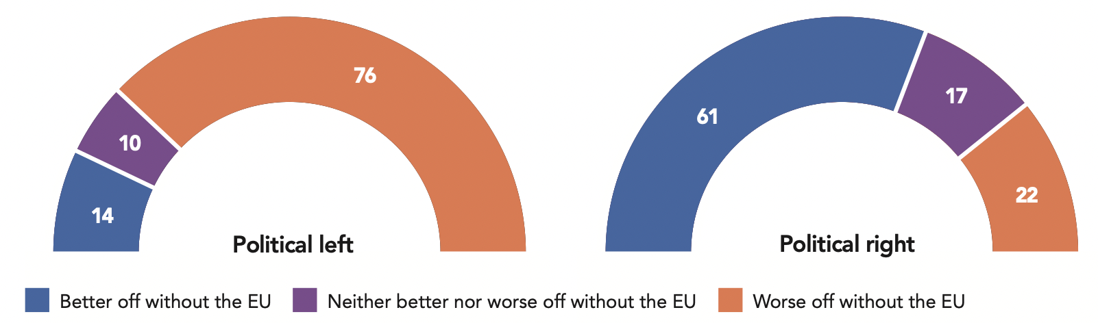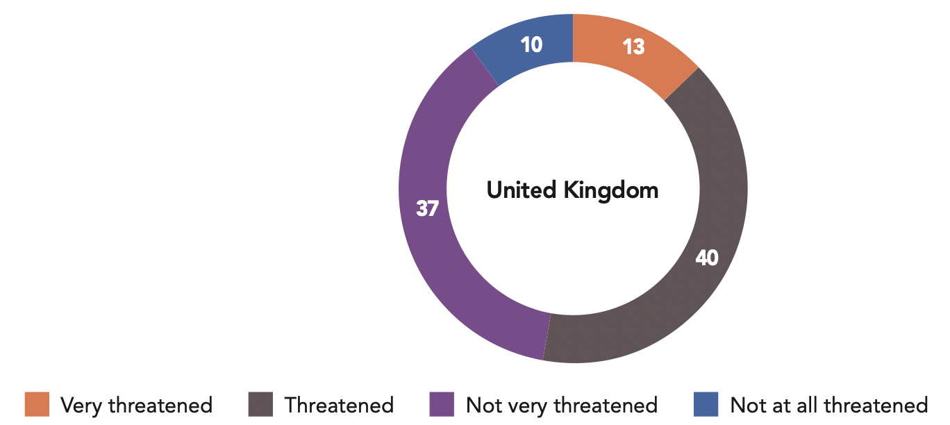 New Zealanders are also the least likely of Anglos to say their lifestyle is threatened: less than one-third hold that sentiment (31%). In sharp contrast to New Zealand, more than half of respondents from both the UK (53%) and the U.S. (51%) say their way of life is threatened. In both the UK and the U.S., those on the political left are more likely to feel threatened (61% and 64% respectively) than those on the right (47% for both countries), possibly a reaction to the political situation in their respective countries. In the UK, Brexit is likely a major driver of insecurity, where the left is also much more likely to think the UK will be worse off without the EU than the right (76% vs. 22%).