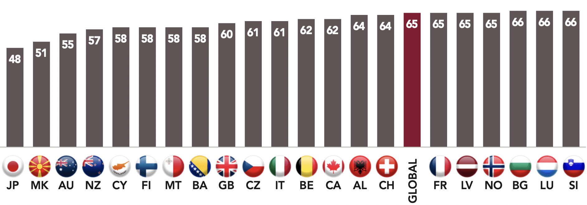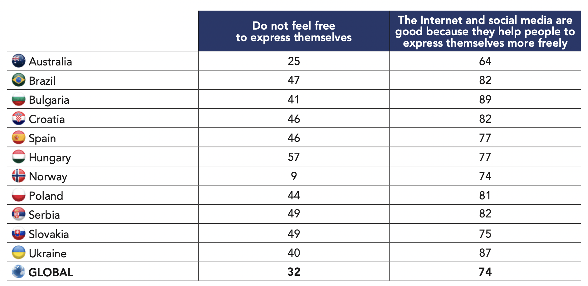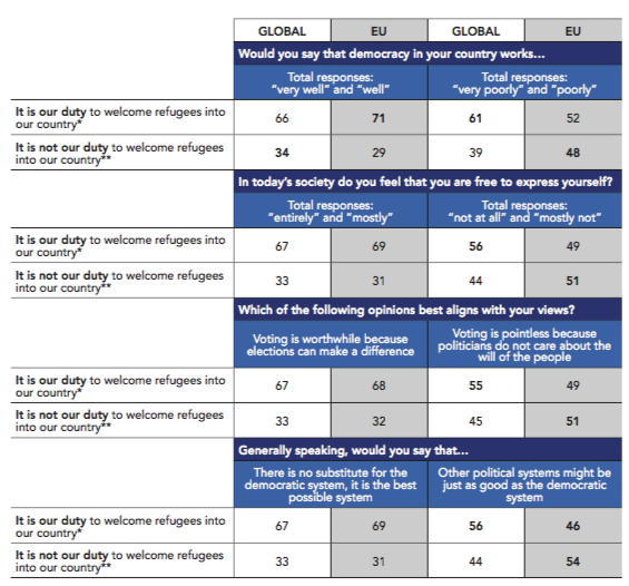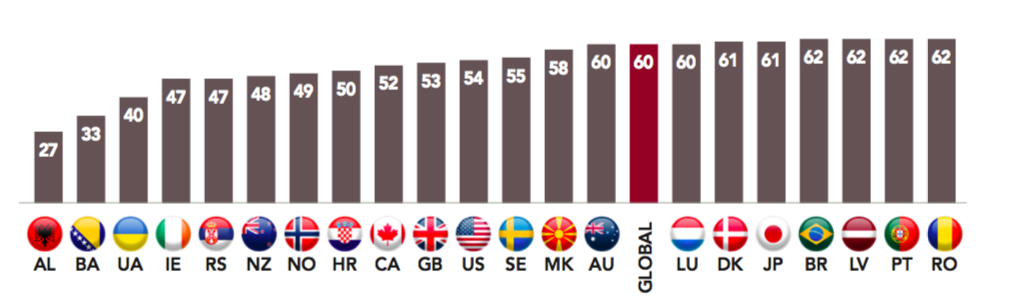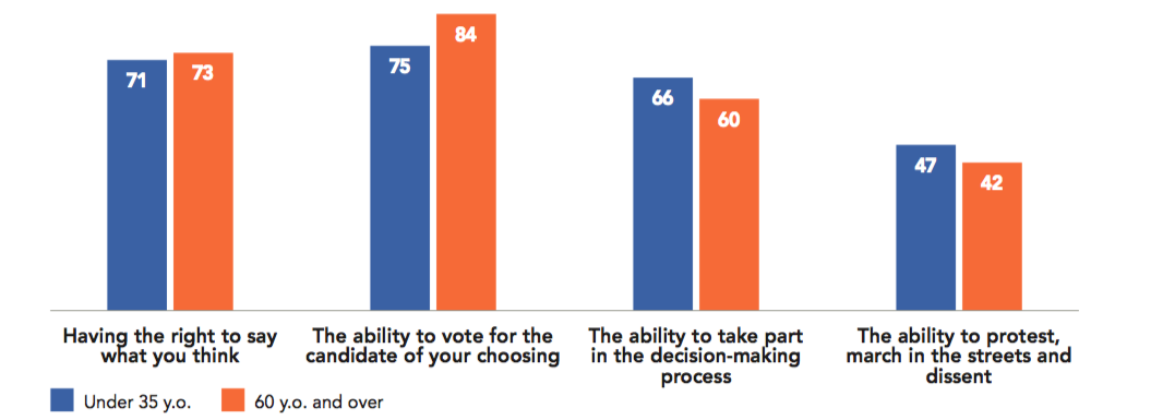 Within the Anglosphere, Canada ranks at the top and Australia at the bottom for these last two questions – 85% of Canadians feel free to express themselves compared to 75% of Australians. A 20-point difference separates the two on the perception of voting, with more Canadians thinking that “voting is worthwhile because elections can make a difference” (84%) compared to Australians (64%).