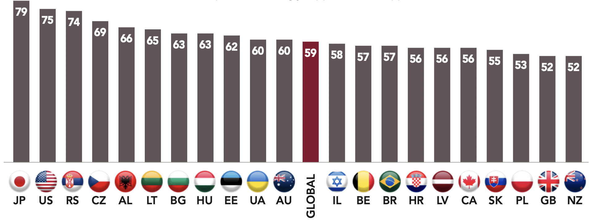 Japan is the country most worried about China (91%). This is the result of a history marked by Japanese control, and this concern is also regional as it is shared by 57% of Australians. In Japan, the majority of respondents (77%) also expressed concern about Russia’s international posture. Current events are fueling concerns about China and Russia in Japan, with the resurgence of military activity in the region on the part of both countries.