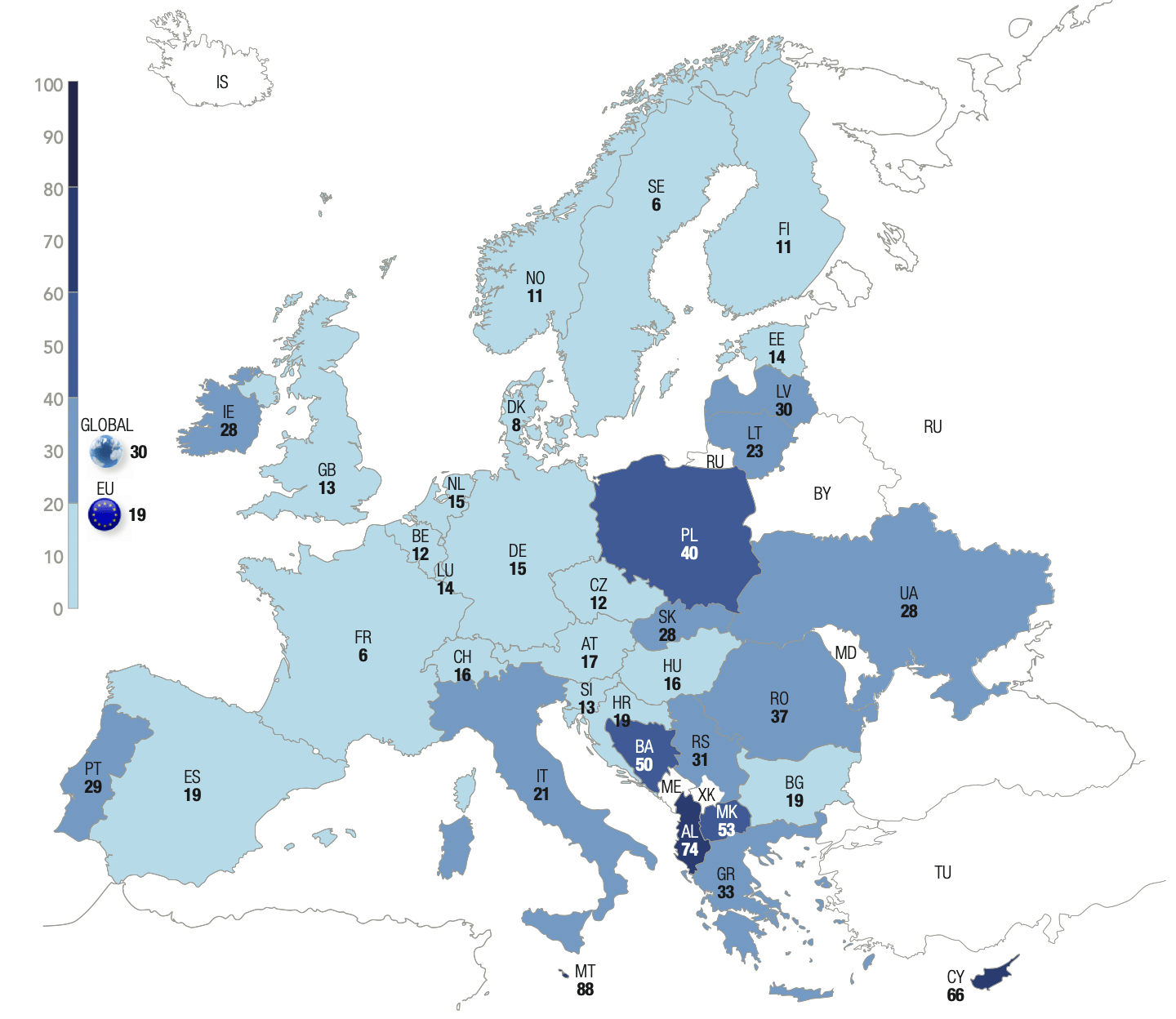 Democracies that have experienced Russian imperialism are particularly worried. This is the case for Romania (68%) but above all for Poland (77%), which was recently affected by Russian military exercises in Kaliningrad on the Polish border.