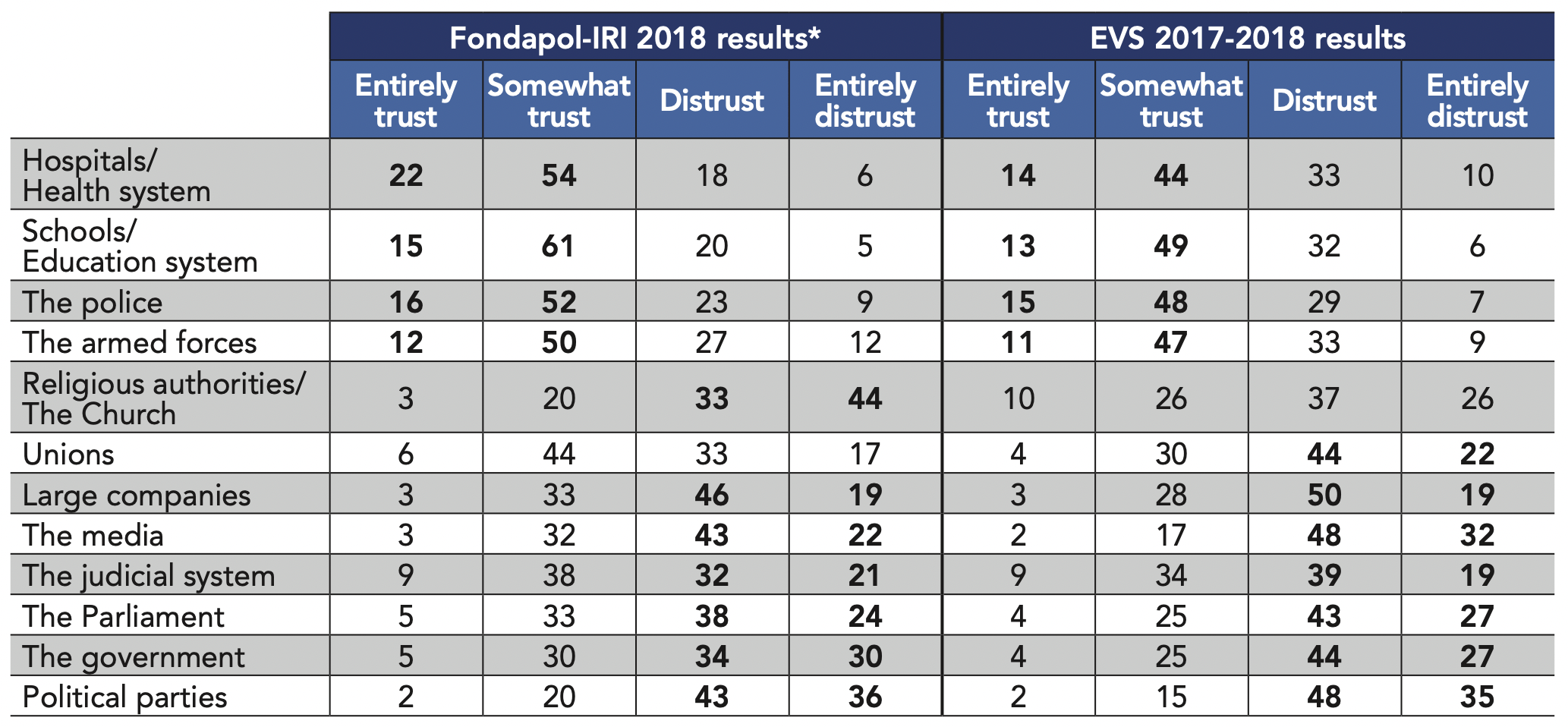 The same is true for the countries of Mediterranean Europe, which are getting closer to the low-trust societies, as the Spanish, Italian, Portuguese and Greek populations are generally less trusting of their institutions than the average of the 42 democracies studied. France appears to be in an intermediate situation: while the French express strong mistrust toward certain institutions (72% for the media, compared to 66% on average in the 42 democracies, 50% for the judicial system versus 43%; 67% for large companies, compared to 59%), they are on average more trusting of Parliament, schools, hospital and medical professions, the armed forces, the police, small and medium-sized businesses and NGOs.