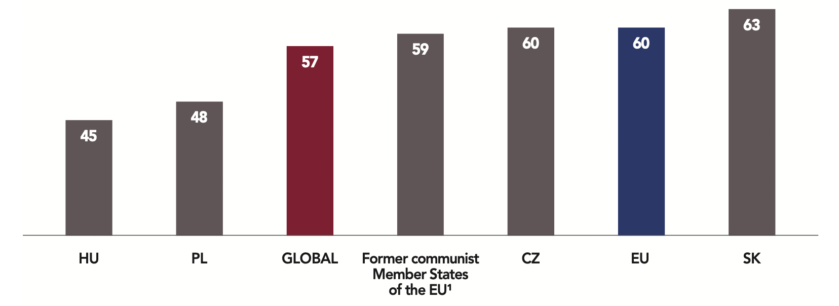 In Hungary, compared to the overall average, institutions do not inspire much trust from the surveyed population. Just under a quarter (24%) of respondents say they trust the Hungarian Parliament. It should also be noted that this mistrust affects community-based institutions that typically enjoy strong public trust, such as schools and hospitals: less than half of Hungarians (46%) trust schools (compared to 75% on average), representing the lowest level of trust among the 42 democracies surveyed, and nearly two-thirds (64%) trust hospitals and medical professions (16 points less than the overall average of 81%).