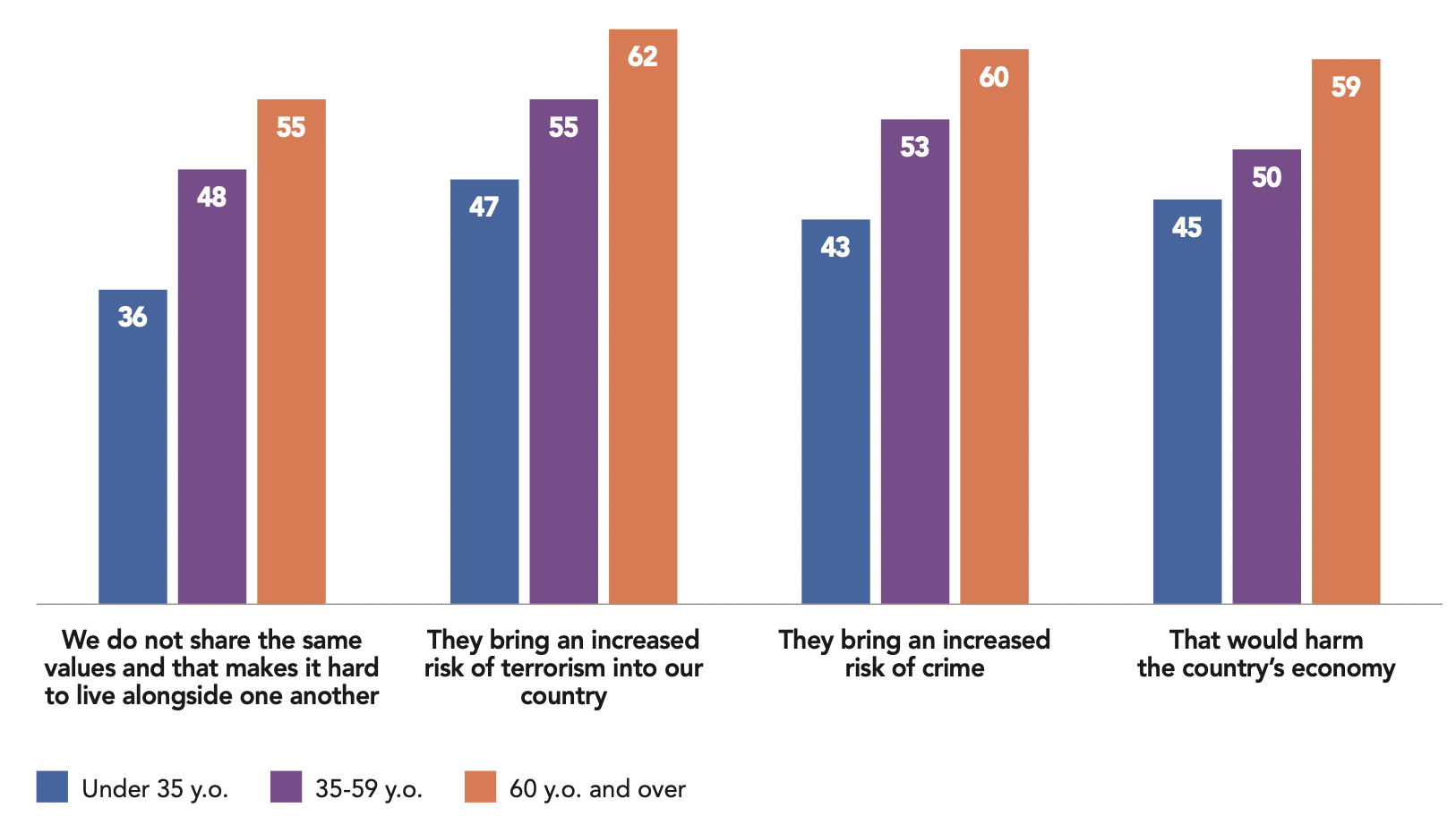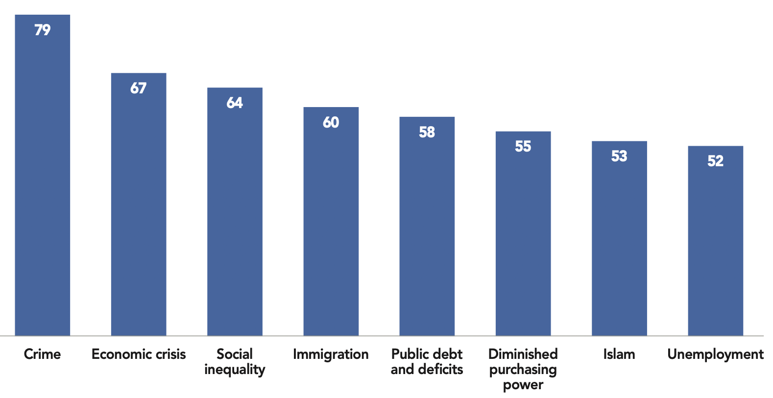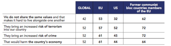 One of the most intriguing differences between the Anglosphere and the EU is the level of concern for future of the “way of life”: the Europeans are indeed much more concerned about Islam than the Anglosphere populations in average (68% of EU citizens are worried compared to 54% of Anglosphere respondents); they are also more worried about immigration (69% versus 57%).