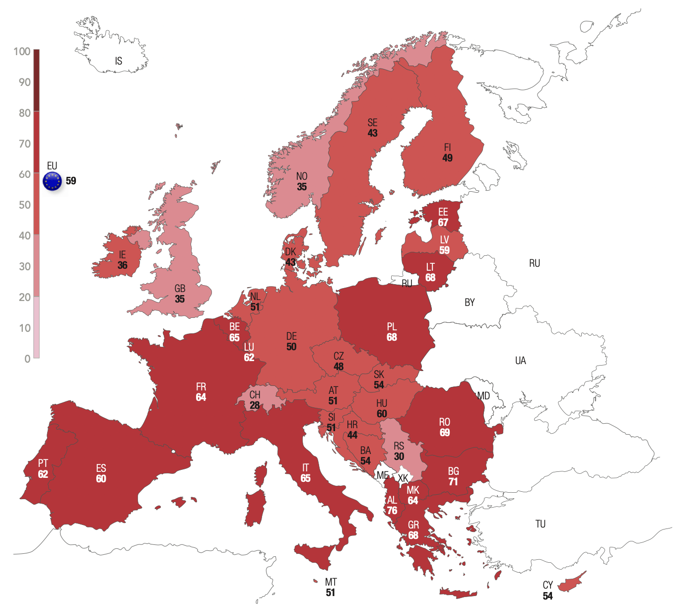 In the Balkan countries applying for membership in the European Union3, the levels of distrust remain well above the EU average for Parliament (73% vs. 60%), the judicial system (68% vs. 50%), the police (49% vs. 28%) and unions (70% vs. 57%). These countries, on the other hand, are more inclined to trust religious authorities (43% compared to an average of 24% for the European Union). In Ukraine, only the armed forces (53%), hospitals and medical professions (54%), schools (66%) and small and medium-sized businesses (74%) hold a majority level of respondents’ trust.