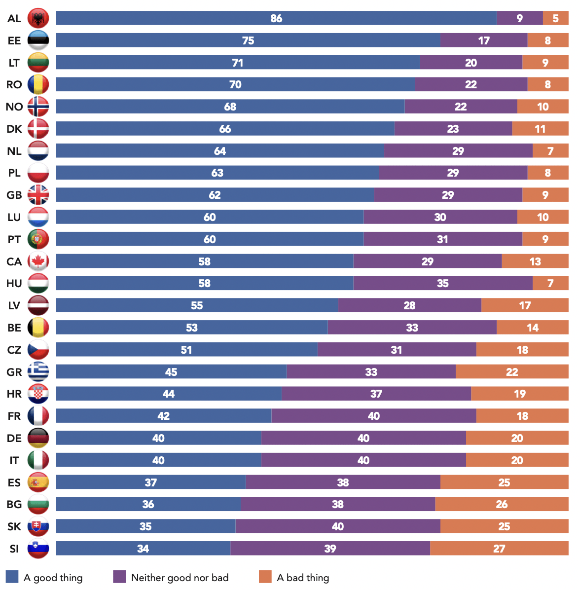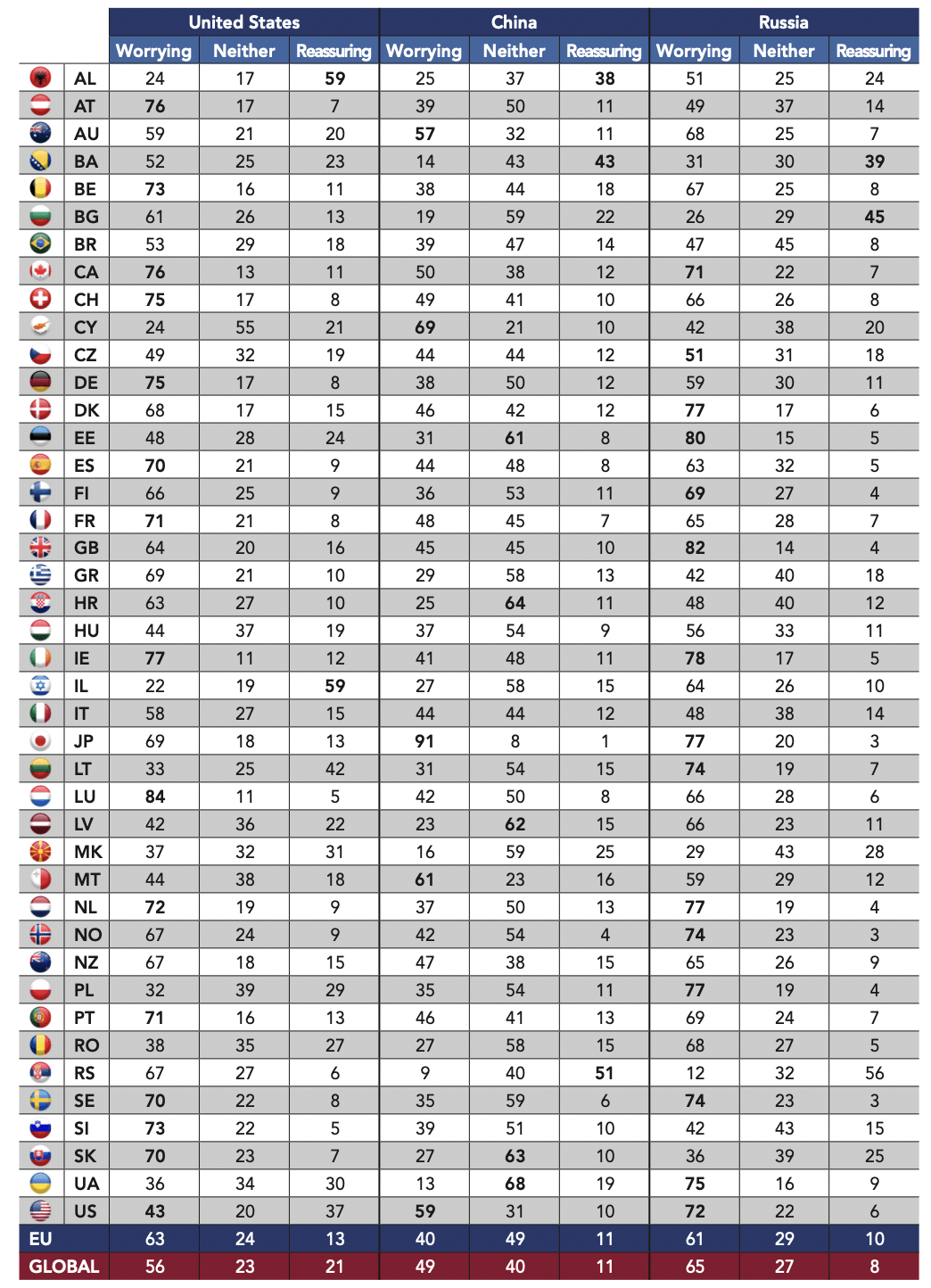 In the Balkans, the memory of American intervention in regional conflicts on the eve of the twenty-first century has left a lasting mark in the minds of the people. Its intervention in favor of the Albanian Kosovars during the Kosovo War probably explains the fact that 59% of Albanians find the international position of the United States reassuring. But this is not the case in the other Balkan countries surveyed, as 67% of Serbs say they are worried about American attitudes, along with 63% of Croatians and 52% of Bosnians. The U.S. bombing of Serbian targets during the Yugoslav wars explains the distrust of Serbia, but also of Bosnia, which has a large population of Serbs. The worry felt by Slovenians (73%) may reflect current events, as recent U.S. tariffs on steel and aluminum may have a significant impact on the Slovenian economy.