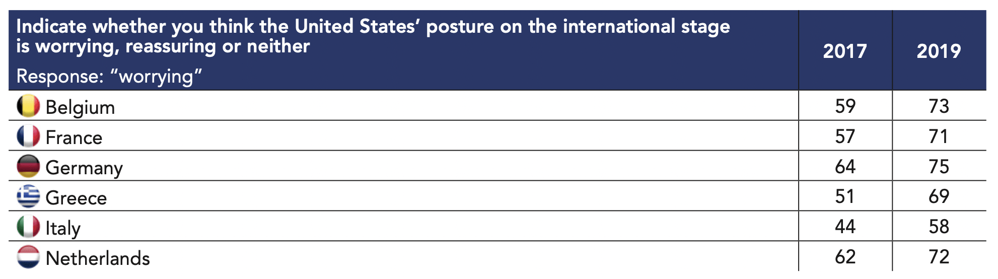 Comparing the figures of our surveys from 2017 to 2019, we observe a significant increase in the proportion of respondents who expressed concern about the attitude of the United States internationally, particularly in historically allied countries.