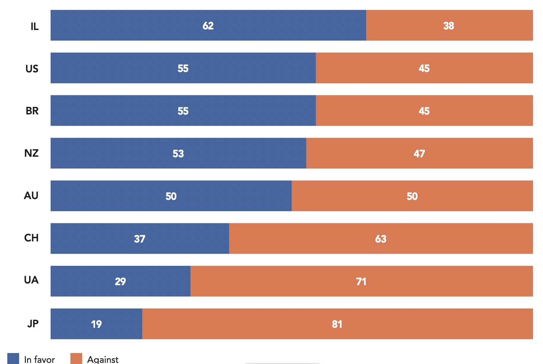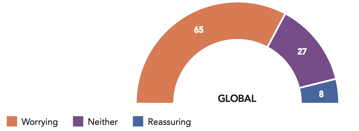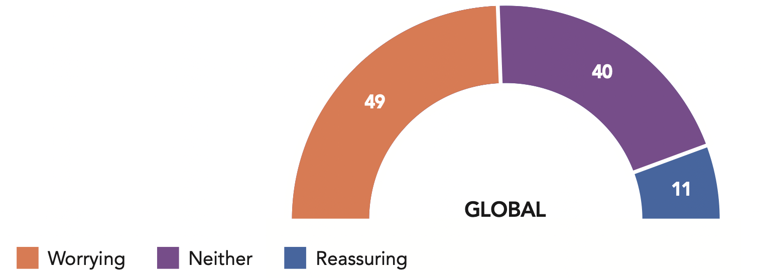 For example, in North America, three quarters of Canadians surveyed (76%) say they are worried about their neighbor’s posture on the international stage, a concern shared by 53% of Brazilians. In Israel, on the other hand, a clear majority (59%) consider the behavior of their powerful ally reassuring, a result of a traditionally strong connection which has been further strengthened by the relocation of the American Embassy in Israel from Tel Aviv to Jerusalem.