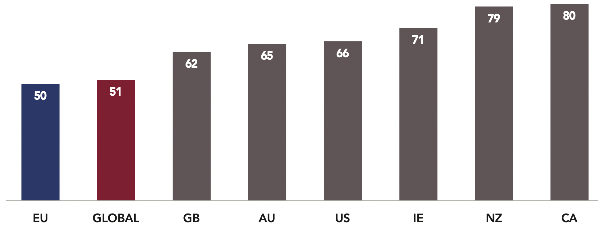 Respondents in the Anglosphere express stronger support for democratic values than EU citizens. Over half of Anglosphere citizens prefer “more freedom even if it causes less order” (55%) compared to just 39% of EU citizens. Similarly, a greater majority of respondents from the Anglosphere (75%) oppose being led by a “strongman who does not have to worry about Parliament or elections”, 9 points higher than EU citizens (66%). The previously mentioned high level of concern among EU citizens likely drives this increased preference for order. Taken together, these results show greater security, or at least perceptions thereof, in the Anglosphere. New Zealand is an exception to this trend within the Anglosphere, as 49% of respondents say that “other political systems might be just as good as the democratic system”, well above the 33% average for the Anglosphere. This result is especially peculiar considering New Zealanders’ evaluation of their country’s democracy. Over three quarters say their country’s democracy works well (79%) – at the same level as Canada (80%), which leads the Anglosphere in terms of confidence in its democracy. New Zealand also has the highest proportion of respondents expressing trust in their government (72%), Parliament (70%) and political parties (57%).