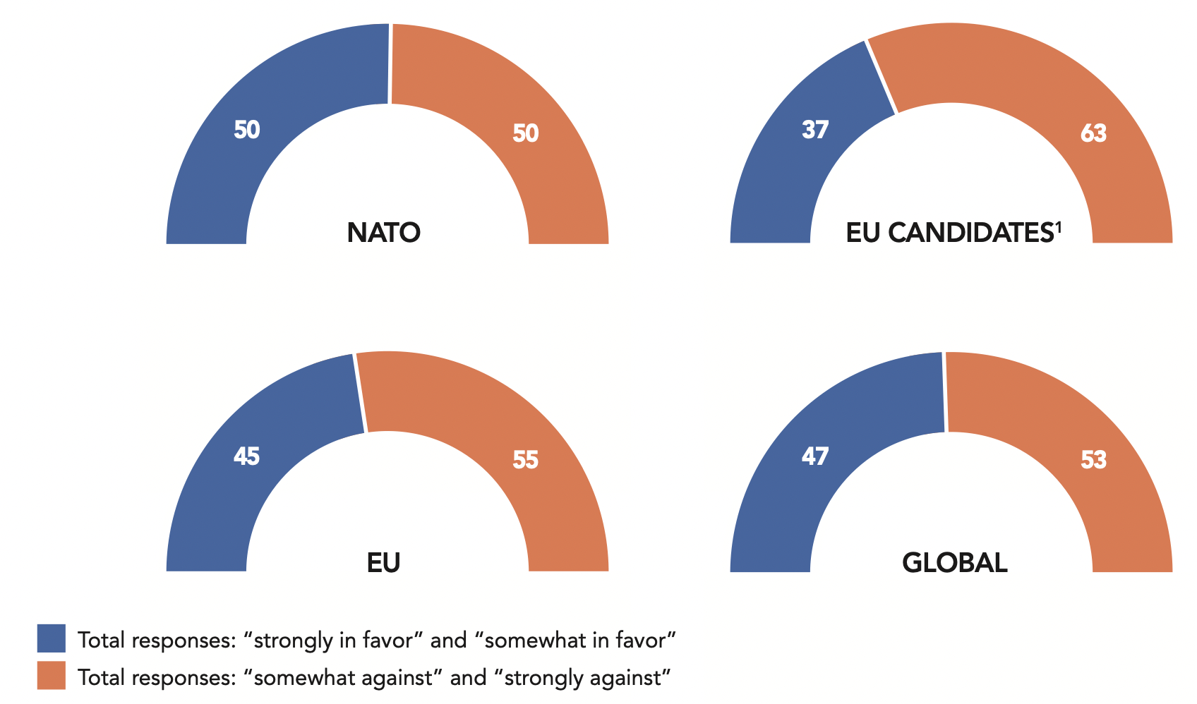 NATO members are evenly split on this question at 50%. The two largest contributors to NATO mirror this as they take opposing views on military intervention, favored by 55% of people in the United States and opposed by 56% of Germans. Among NATO countries, excluding the United States, a majority of citizens support this type of military intervention in Albania (74%), Portugal (64%), Denmark (62%), Belgium (58%), the Netherlands (55%), Canada (55%) and France (52%). British and Luxembourger citizens are evenly split on this question (50% in favor and 50% against).