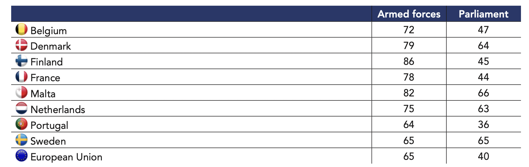 Among Member States, public opinion in the countries of the former Western Europe2 hold moderately more favorable views toward the exercise of military force in defense of democratic values (48% in favor and 52% against) compared to former communist Member States3 (37% in favor and 63% against). Eight of the twenty- eight Member States have majority support for this proposition: Portugal (64%), Sweden (63%), Denmark (62%), Belgium (58%), Malta (56%), Finland (55%), the Netherlands (55%), and France (52%). Interestingly, a clear majority of respondents in these countries believe their domestic democracy functions well: 53% in France, 60% in Belgium, 62% in Portugal, 69% in Finland and in the Netherlands, 74% in Malta, 76% in Sweden and 83% in Denmark. With the exception of Portugal, these nations also share greater trust in institutions, such as the armed forces and Parliament, compared to the European Union on the whole.