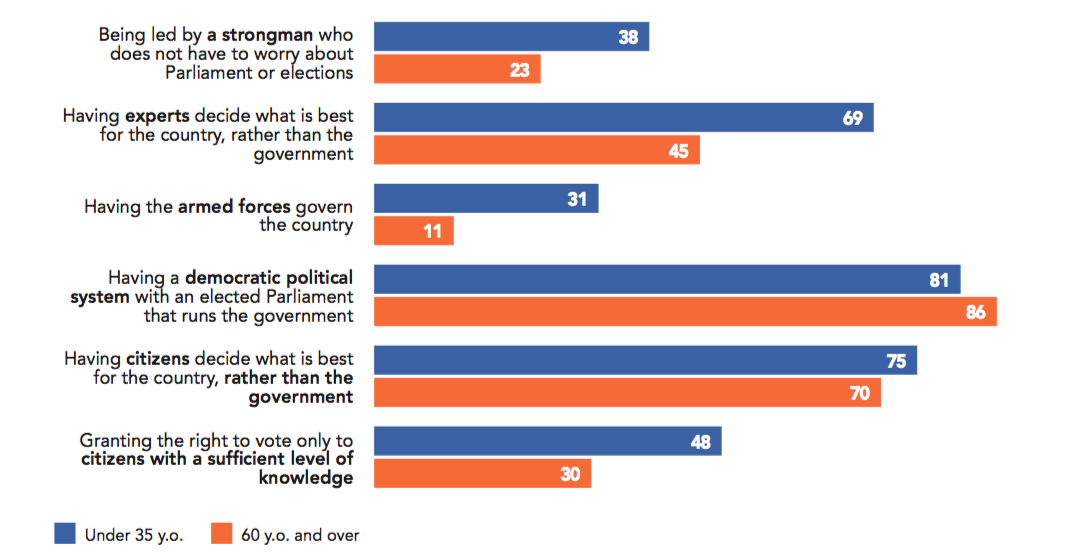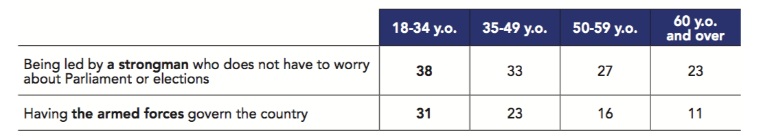 For instance, Japan’s antimilitarism, enacted in its post-World War II Constitution, is reflected in its citizens’ strong opposition (81%) to military intervention, putting the country on par with Serbia (81%) as the least supportive of military intervention out of the 42 democracies surveyed. Strikingly, seven out of ten respondents in Ukraine (71%) are against the idea of democratic countries intervening in other countries to defend democratic values. The confrontational relationship with neighboring Russia and the ongoing war in the Donbass region might otherwise suggest that Ukrainians would rely on strong support from the democratic world. One could also interpret the Israelis’ strong support (62%) for military intervention as an echo of the strong relationship citizens have with the armed forces: an overwhelming majority trust them (90%), with 52% declaring they ‘entirely trust’ them, which is 31 points above the poll-wide average of 21%.