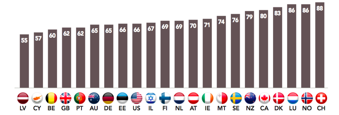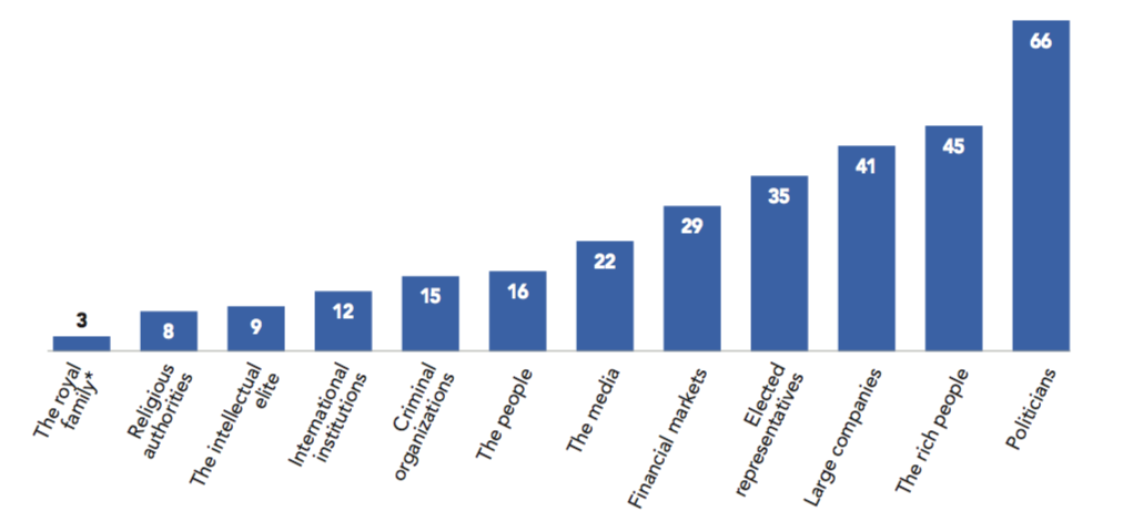 Anglosphere democracies also exhibit high levels of trust in their institutions. Australians, British, Canadians and New Zealanders have a higher than average level of trust than the rest of democratic world for each of the institutions cited in the survey. We can also name the United States a high-trust society, even though a majority of respondents expressed mistrust towards large companies (53%), the media (56%) and political parties (65%).