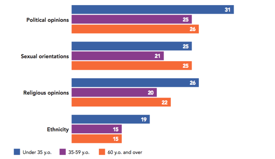 It is also worth mentioning the strong surge of evangelical Christianity in the context of rising conservatism. This survey shows that Brazil is one of the countries that trusts religious authorities the most (43%) and is therefore most opposed to abortion (65%, the fourth population most hostile to this right). Evangelical voters played a decisive role in the election of Jair Bolsonaro. Paradoxically, however, Brazil is among the most open countries in terms of its tolerance for people with different religious opinions (90% versus the overall average of 78%), different sexual orientation (85% versus the overall average of 77%) and different political opinions than their own (86% versus the overall average of 73%). This seems to contradict the new president’s homophobic and intolerant rhetoric, particularly during the election campaign.