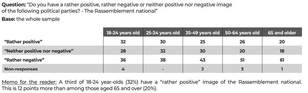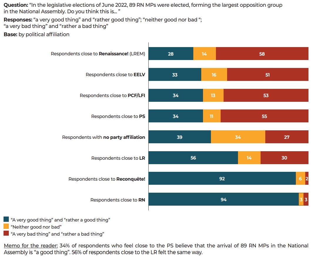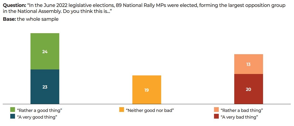 3. Almost half of voters (47%) see it as “a good thing” that “in the June 2022 legislative elections, 89 RN MPs were elected, forming the largest opposition group in the National Assembly”. It is considered a “bad thing” for 33% of respondents and ”neither a good nor a bad thing” for 19%.