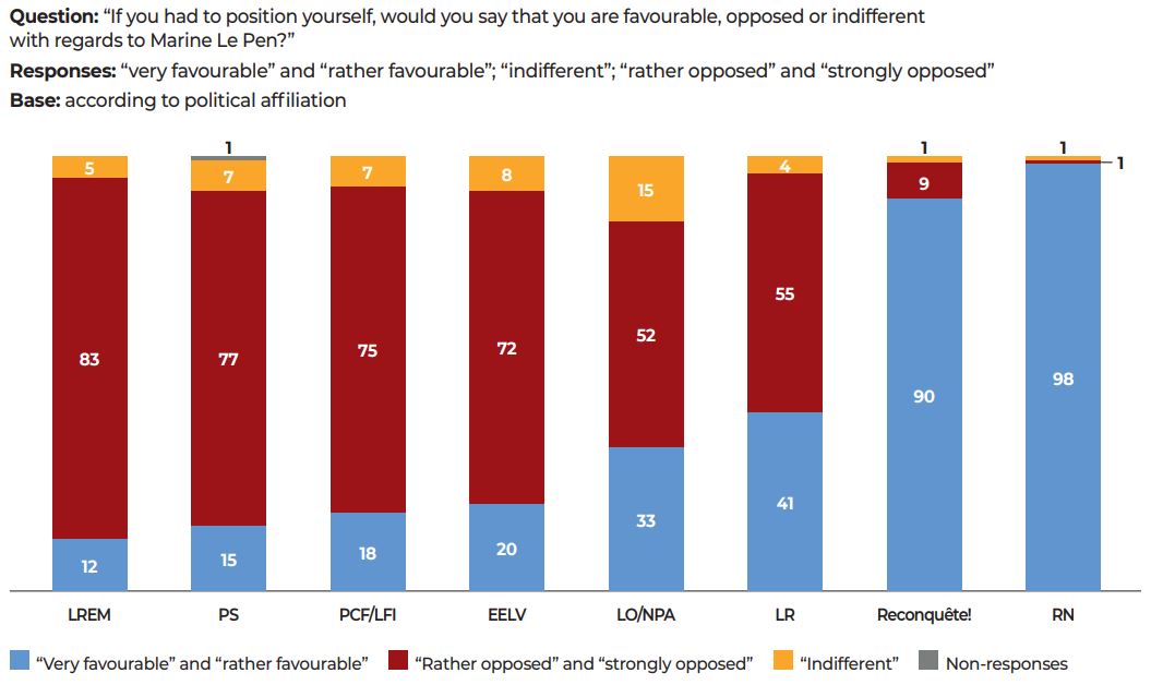 As we will see below, a fraction of Jean-Luc Mélenchon and LFI supporters will not hesitate to vote for Marine Le Pen or RN to try to defeat Emmanuel Macron in the presidential election or one of his candidates in the legislative elections. The same is true, symmetrically, for a fraction of Marine Le Pen and RN voters. To illustrate this, we should note that in the legislativeelections, in the case of constituencies where, in the second round, the RN was opposed to Ensemble!, nearly a third (30%) of Nupes voters in the first round answered that their second round choice had been primarily motivated by their desire to “strengthen the opposition to Emmanuel Macron”.