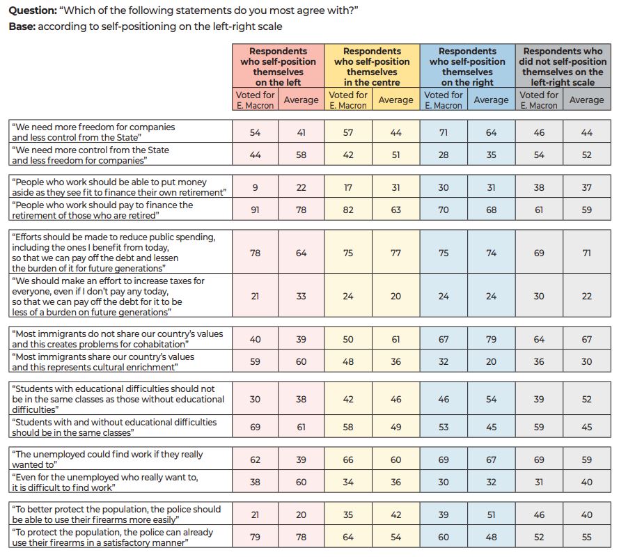 2. Emmanuel Macron’s voters who position themselves on the right (47%), those who position themselves in the centre but who adhere to a right-wing value system (9.4%), those who do not position themselves on the political spectrum but who adhere to a right-wing value system (6.5%), lead us to estimate the proportion of right-wing voters in Emmanuel Macron’s electorate at 62.7%.