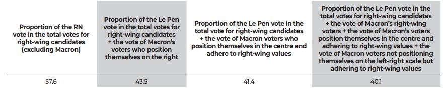 11. In the first round of the 2022 legislative elections, the RN vote represented between a third and a half of the right-wing vote, depending on the criteria used (see below page 36).
