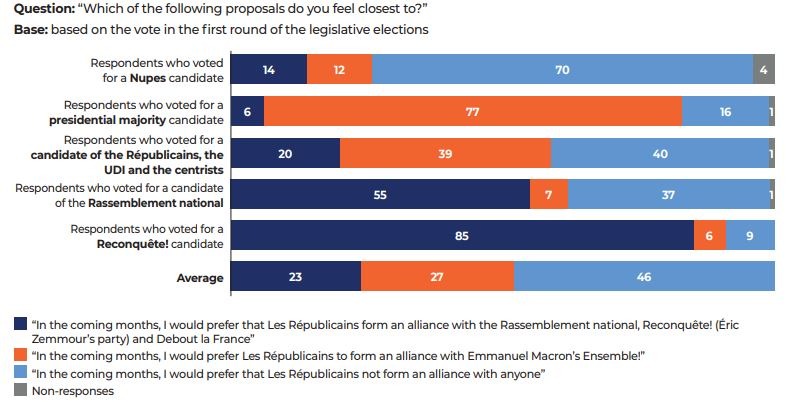 We then asked respondents to comment specifically on the alliances that LR should form. Indeed, given the parliamentary state of affairs, marked both by the absence of an absolute majority and by the impossibility for the presidential coalition to establish a formal alliance with the Nupes or with the RN, the hypothesis of an alliance seems to necessarily and mainly involve LR.