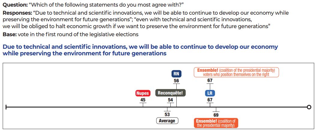 5. More than half (53%) of the voters believe that “thanks to technological and scientific innovations, we can continue to develop our economy while protecting the environment for future generations”. This opinion is held by a majority of Reconquête! (54%), RN (56%), LR (67%) and Ensemble! (69%) voters. This opinion is the least visible among Nupes voters (45%).