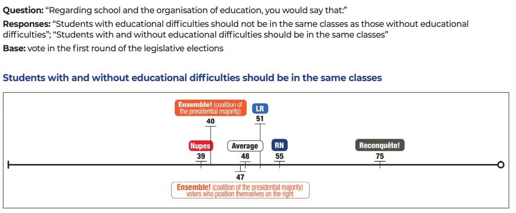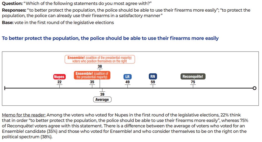 It should be noted that Ensemble! voters have the most similar position (51.3%) to that of public opinion (51%). The biggest differences from this public opinion are on the side of voters who voted for the most left-wing coalition, the Nupes (34.4%), i.e. a difference of 16.6 points with the average opinion, and on the side of voters who voted the most right-wing, the RN (60.6%), i.e. a difference of 9.6 points, or Reconquête! (69.6%), a gap of 18.6 points.