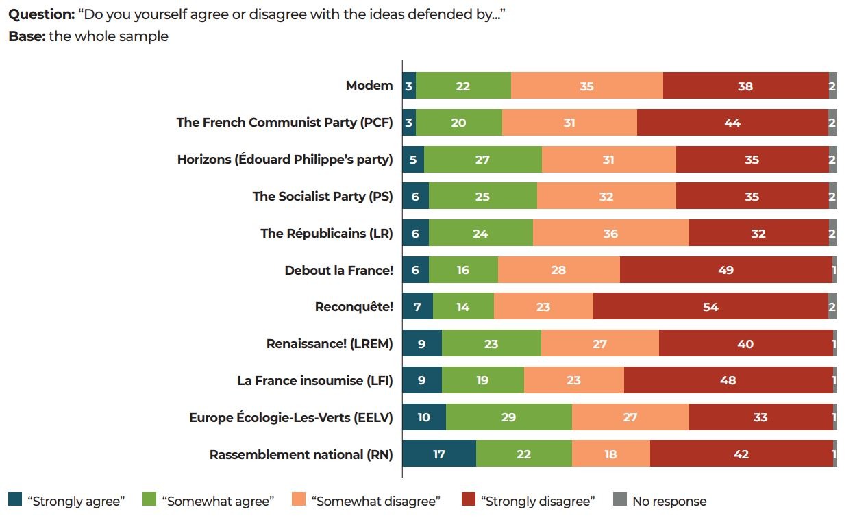 7. EELV and the RN are the two parties whose ideas attract the most support. In both cases, 39% of respondents “strongly agree” or “somewhat agree” with the ideas of the two parties. On the other hand, it is with the RN’s ideas that the greatest number of voters “strongly agree” (17%).