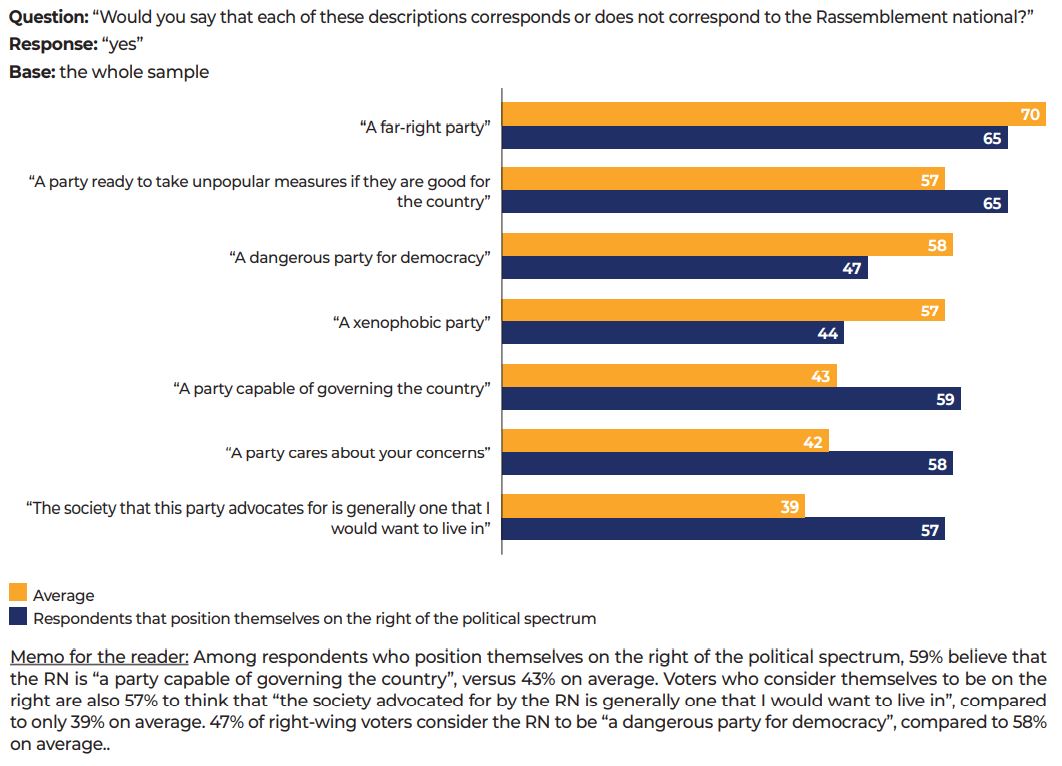 Finally, in the context of a political upheaval on the right, it is important to note that, among voters who position themselves on the right, less than half (47%) consider the RN to be dangerous for democracy16. An even smaller proportion consider it to be ‘’xenophobic’’ (44%). Conversely, the majority of right-wing voters consider the RN to be capable of governing (59%), believing that it advocates for a society in which they would like to live (57%).