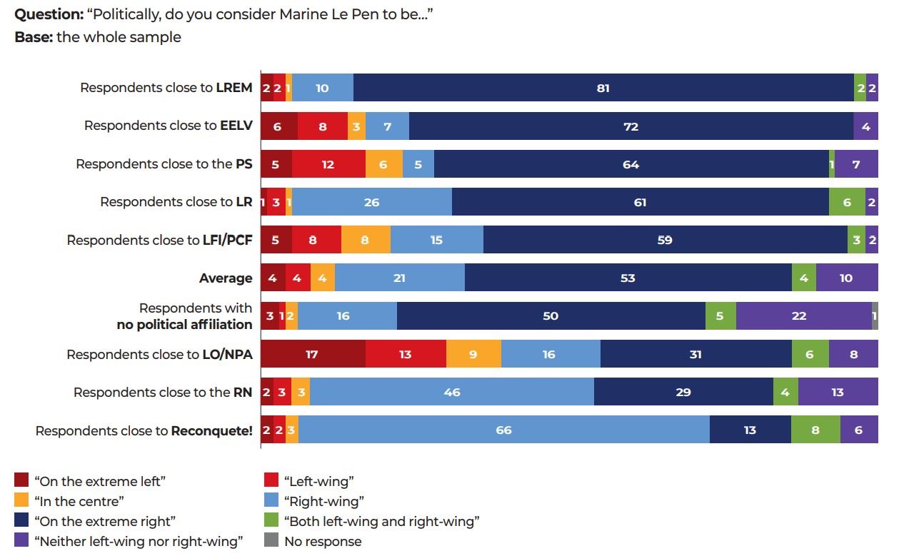 2. Most of the voters close to the RN (71%) do not classify Marine Le Pen as “far right”. This is also the case for those close to Reconquête! (87%) or LO-NPA (69%). Among the voters who still mostly place Marine Le Pen on the far right, there are significant variations between those close to the PCF-LFI (59%), the LR (61%), the PS (64%), EELV (72%) and LREM (81%).