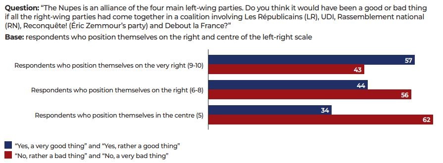 It is important to note that the hypothesis of a right-wing alliance (LR-RN-DLF-Reconquête!) appeals to a majority of RN voters (55%), but it is rejected by a minority whose weight cannot be ignored (45%) and this alliance of the right is only really supported by Reconquête! voters (85%). Overall, two thirds (62%) of voters who position themselves very much to the right (i.e. 9 and 10 on the left-right scale) prefer a LR-RN-DLF-Reconquête! alliance. The further to the right the voters are or vote, the more they consider it “a good thing” that the right-wing parties come together in an electoral coalition (LR-RN-DLF-Reconquête!) comparable to Nupes. Further right, support is stronger but fewer voters are concerned.