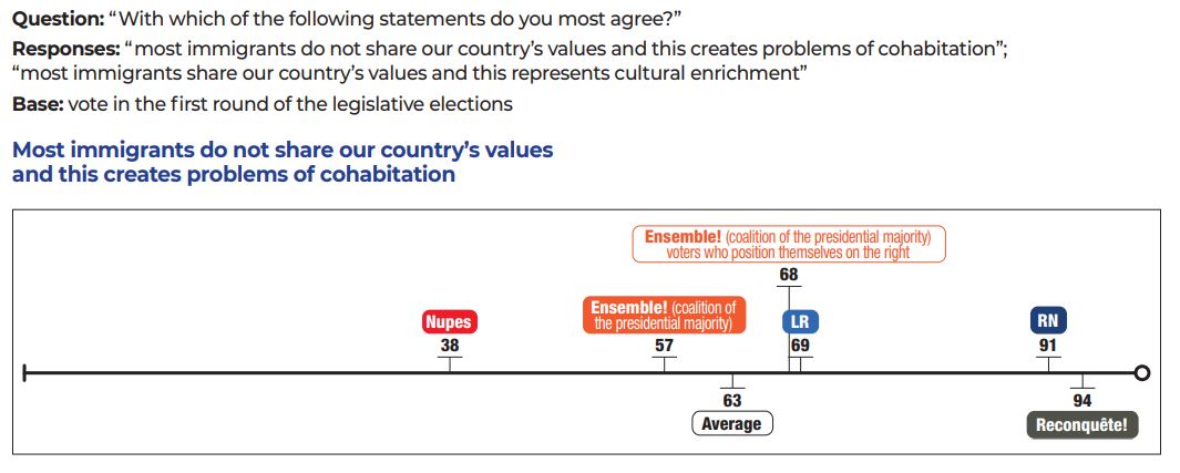 1. Immigration is a concern for public opinion: 63% of voters think that “most immigrants do not share the values of our country and this poses a challenge for coexistence”. This is the majority opinion among Ensemble! (57%), LR (69%), RN (91%) and Reconquête! (94%). On the other hand, this opinion is in the minority among Nupes voters (38%).