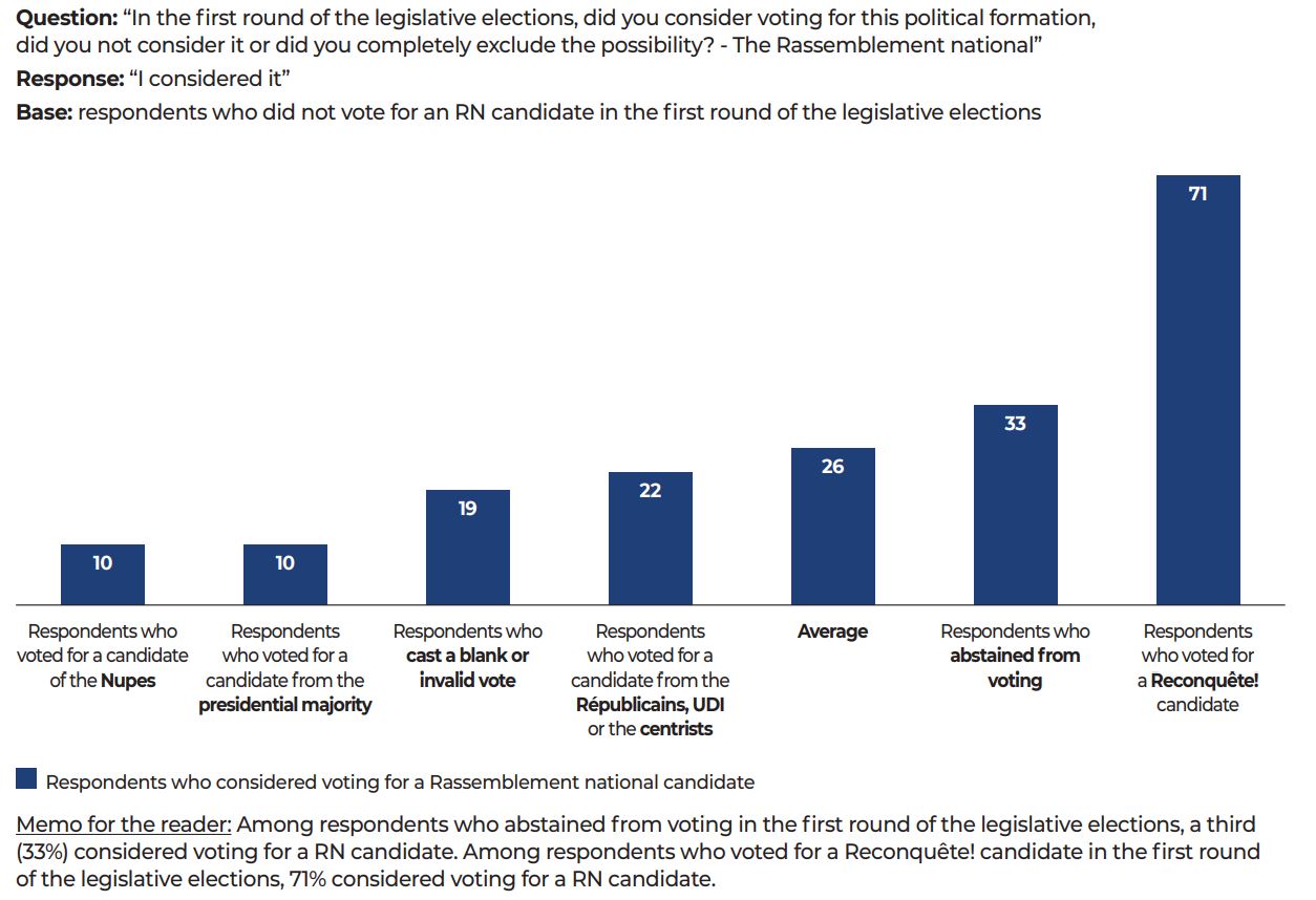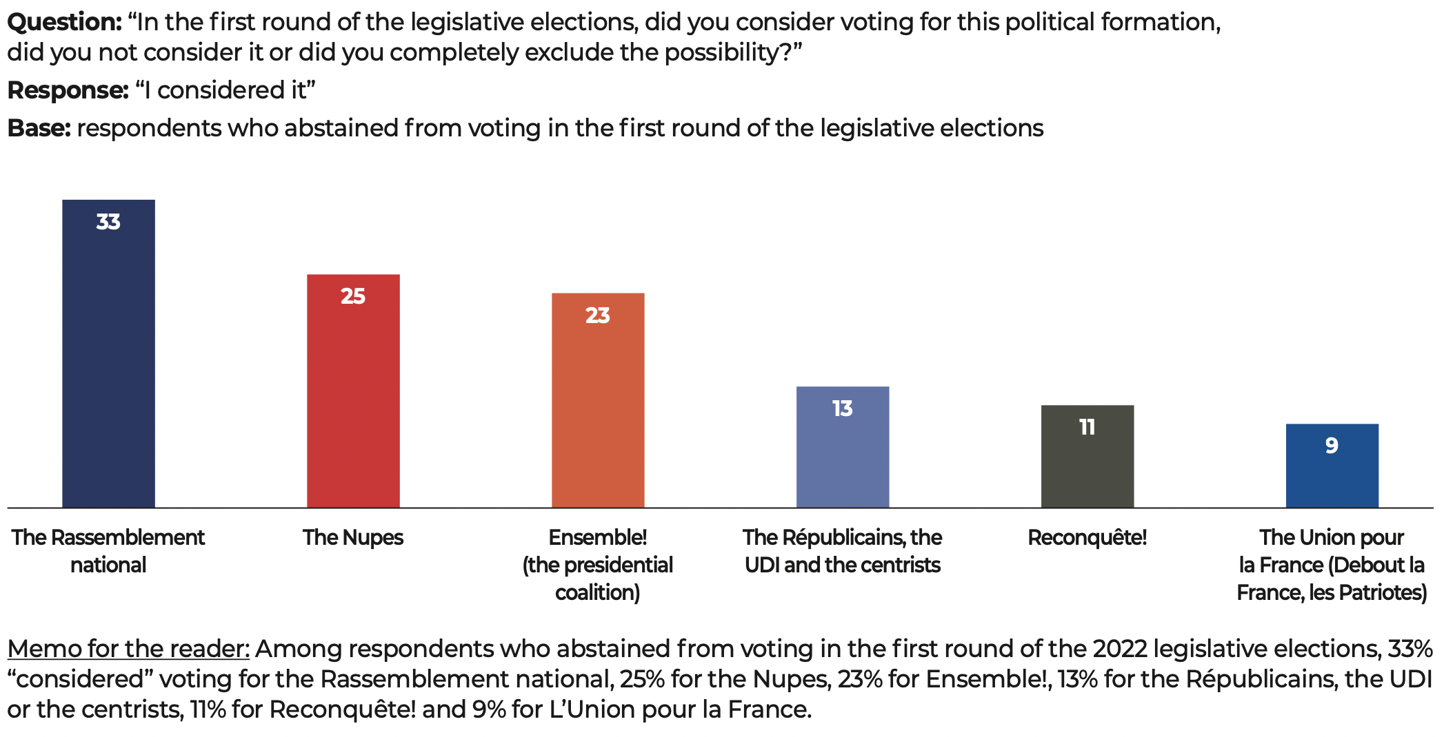 The RN achieved its best score in the June 2022 legislative elections, but it still has stockpiles of votes: on average, 26% of voters who did not vote for the RN considered doing so, compared to the 21% of voters who did not vote for the Nupes after considering it and the 20% of those who did not vote for Ensemble! but considered doing so.