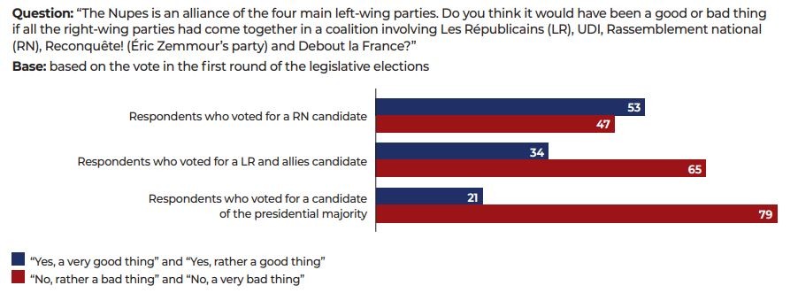 But what about on the right? In the days following the legislative elections, we asked voters whether a symmetrical coalition of the right-wing parties LR-RN-Reconquête!-Debout la France would have been a good or bad thing for these elections. The prospect of such an alliance is considered a “bad thing” by 62% of respondents, while a third (36%) see it as a “good thing”.