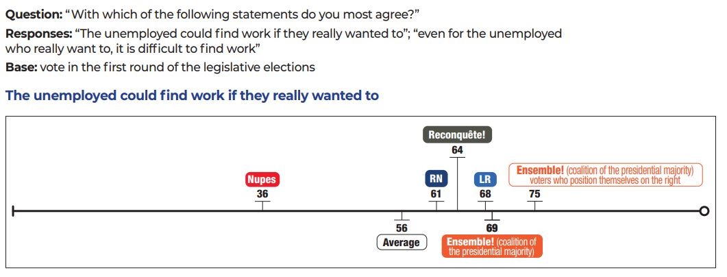 3. More than half (56%) of voters think that “unemployed people could find work if they really wanted to”. This opinion is held by a majority of RN (61%), Reconquête! (64%), LR (68%) and Ensemble! (69%) voters. This opinion is in the minority among Nupes voters (36%).