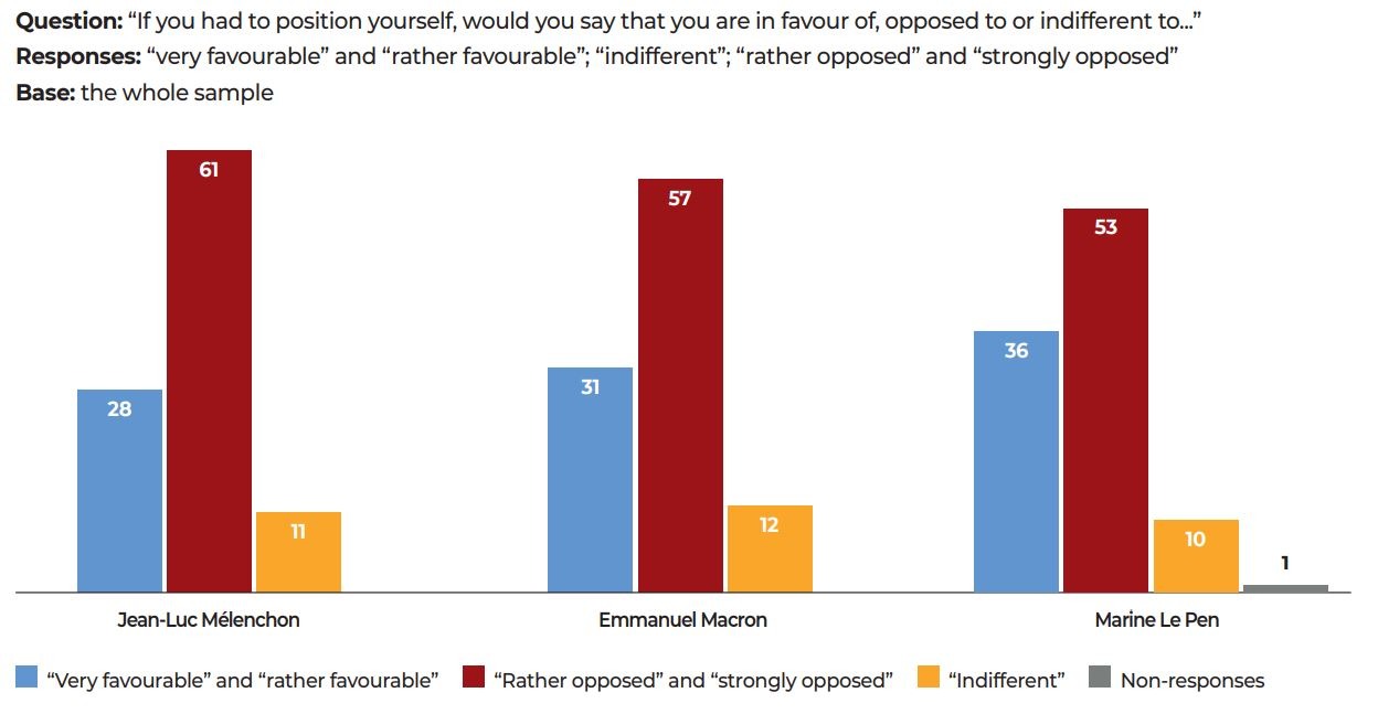 1. Out of the three main candidates in the presidential election, Emmanuel Macron, Marine Le Pen and Jean-Luc Mélenchon, the RN candidate has the lowest level of rejection (53%) and the highest level of support (36%).