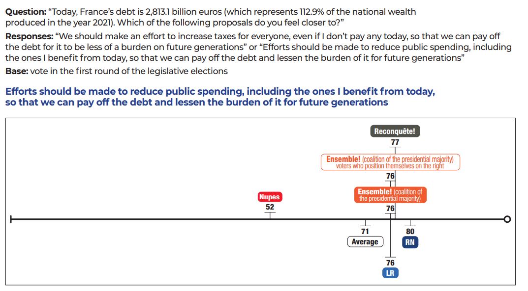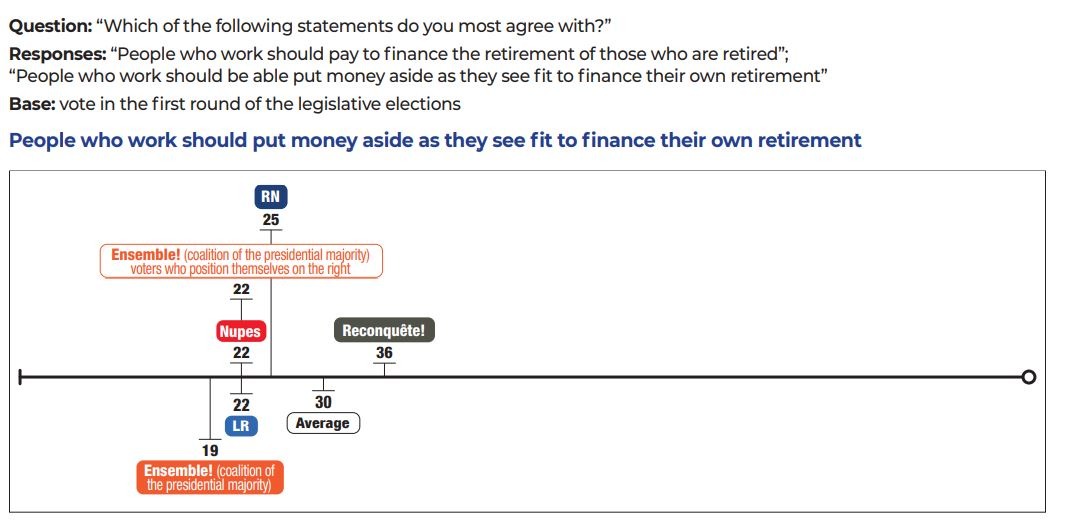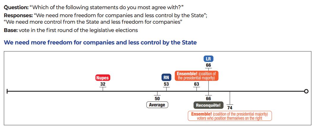 4. The opinion that “there should be more freedom for companies and less control by the state” is shared by 50% of voters. This was the majority opinion among RN voters (53%), as well as Ensemble! (63%), LR (66%) and Reconquête! (66%) voters. This a minority opinion among Nupes voters (32%).