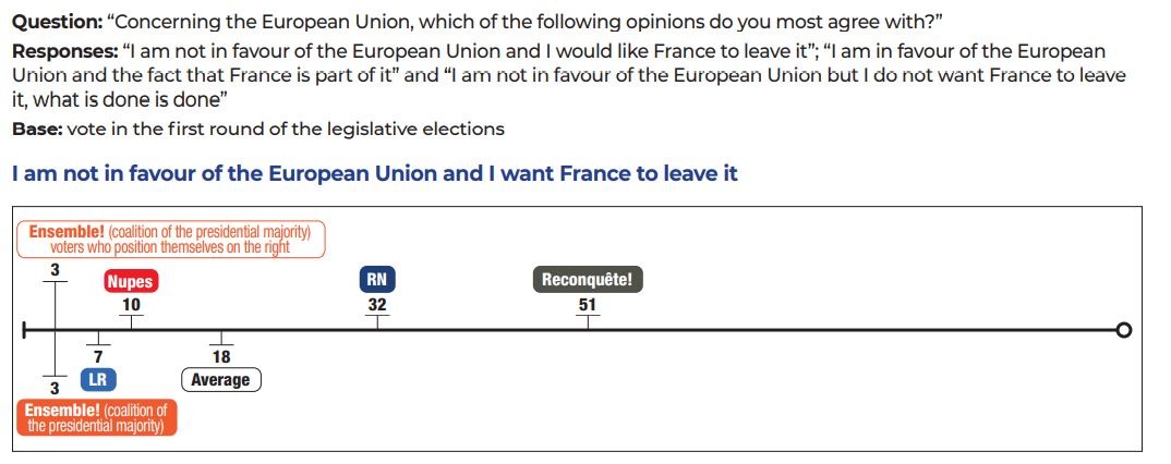 In this respect, one of the most significant issues is the question of the European Union. Measured on numerous occasions in our previous work, the attachment of the French to the European Union and the euro is strong and constant. Less than a fifth of voters surveyed (18%) want France to leave the European Union. The level of desire for a “Frexit” is 7% among LR voters and 3% for Ensemble! but it jumps to 32% for RN voters and is even in the majority among Reconquête! (51%). It is hard to see how LR could get anywhere near political formations that cultivate this rejection of the European Union when more than three quarters of voters do not want their country to withdraw from the European Union.