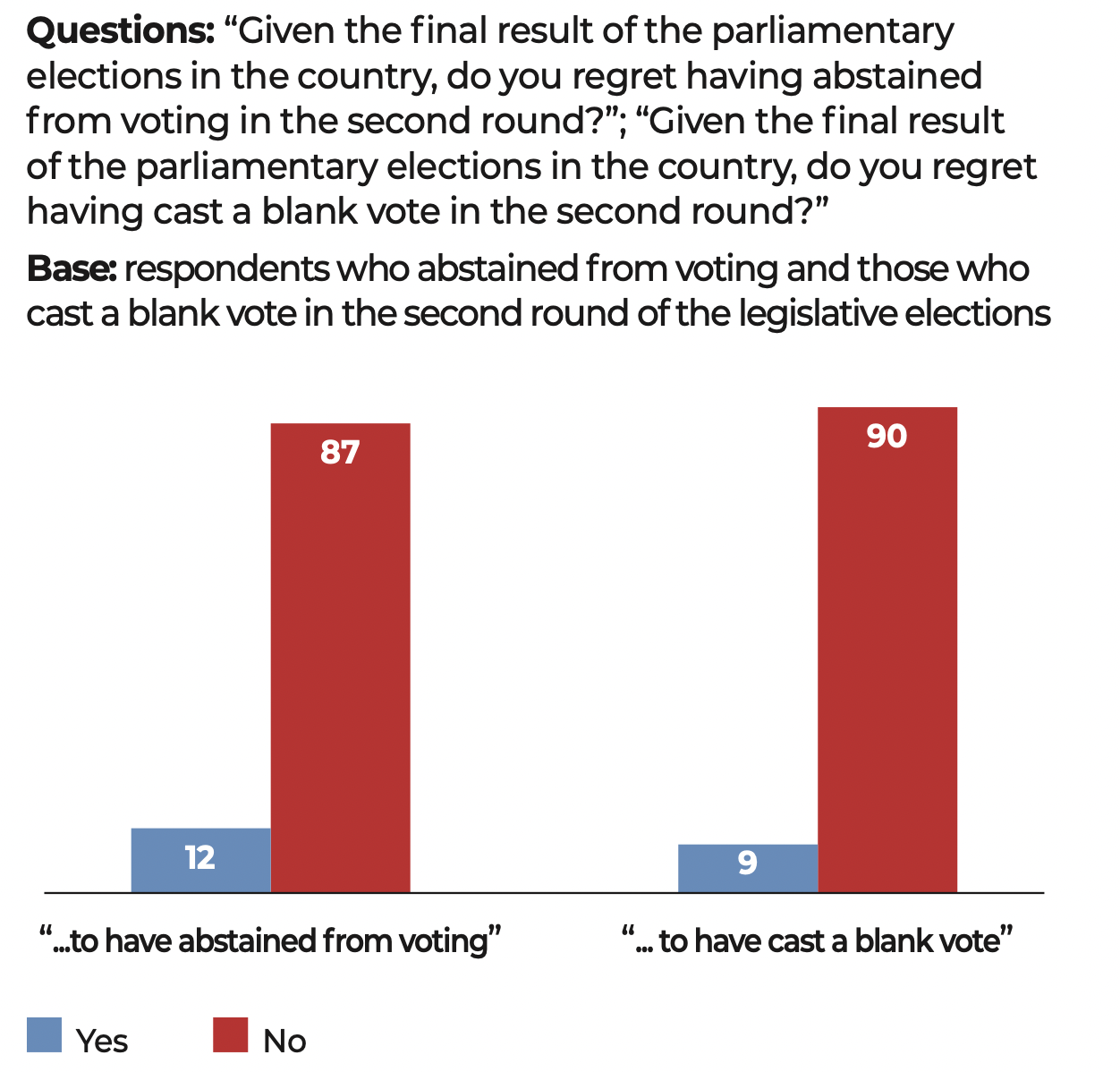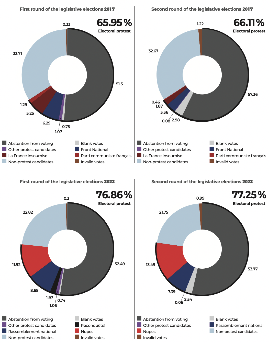 1. If we consider the votes cast in favour of a protest party, abstention from voting or blank votes1 during the legislative elections, more than three quarters of the registered voters were involved in electoral protest: 76.9% for the first round and 77.3% for the second round. We show that 87% of voters who abstained from voting in the second round do not regret it.